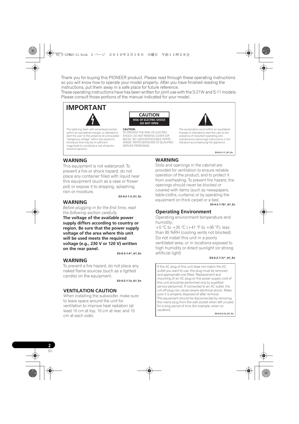 D3-42-13 A1 En WARNING Before plugging in for the first time, read the following section carefully. The voltage of the available power supply differs according to country or region. Be sure that the power supply voltage of the area where this unit will be used meets the required voltage (e.g., 230 V or 120 V) written on the rear panel.
