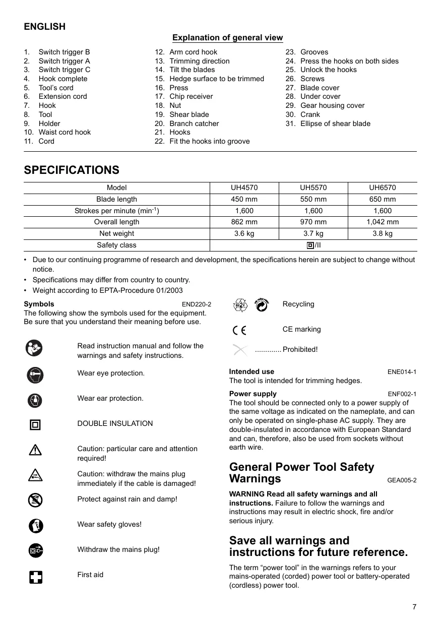 • These accessories or attachments are recommended for use with your Makita tool specified in this manual. The use of any other accessories or attachments might present a risk of injury to persons. Only use accessory or attachment for its stated purpose. If you need any assistance for more details regarding these accessories, ask your local Makita Service Center. • Blade cover • Hook complete • Shear blade assembly • Waist cord hook • Arm cord hook For European countries only Noise ENG102-2 The typical A-weighted noise level determined according to EN60745: Sound pressure level (LpA): 89.9 dB (A) Sound power level (LWA): 97.9 dB (A) Uncertainty (K): 1.5 dB (A) Wear ear protection. Vibration ENG231-1 The vibration total value (tri-axial vector sum) determined according to EN60745: Work mode : hedge trimming Vibration emission (ah): 6.7 m/s2 Uncertainty (K): 1.5 m/s2 EC Declaration of Conformity ENH021-2 We Makita Corporation as the responsible manufacturer declare that the following Makita machine(s): Designation of Machine: Hedge trimmer Model No./ Type: UH4570, UH5570, UH6570 are of series production and Conforms to the following European Directives: 2000/14/EC, 98/37/EC until 28th December 2009 and then with 2006/42/EC from 29th December 2009