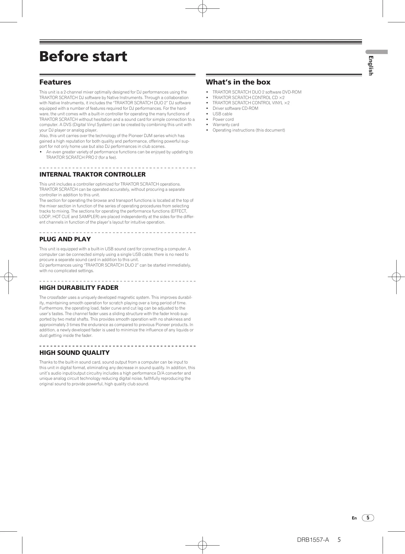 Thanks to the built-in sound card, sound output from a computer can be input to this unit in digital format, eliminating any decrease in sound quality. In addition, this unit's audio input/output circuitry includes a high performance D/A converter and unique analog circuit technology reducing digital noise, faithfully reproducing the original sound to provide powerful, high quality club sound. What's in the box +__ TRAKTOR SCRATCH DUO 2 software DVD-ROM +" TRAKTOR SCRATCH CONTROL CD x2 +" TRAKTOR SCRATCH CONTROL VINYL x2 + Driver software CD-ROM + USB cable + Power cord + Warranty card + Operating instructions (this document) DRB1557-A 5