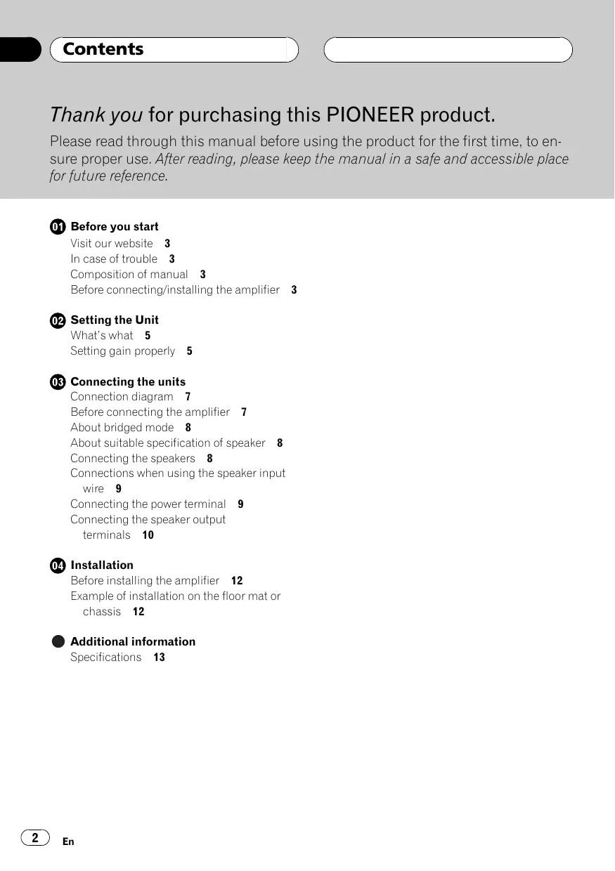 Thank you for purchasing this PIONEER product. Please read through this manual before using the product for the first time, to ensure proper use. After reading, please keep the manual in a safe and accessible place for future reference. Before you start Visit our website 3 In case of trouble 3 Composition of manual 3 Before connecting/installing the amplifier Setting the Unit What’s what 5 Setting gain properly 5 Connecting the units Connection diagram 7 Before connecting the amplifier 7 About bridged mode 8 About suitable specification of speaker 8 Connecting the speakers 8 Connections when using the speaker input wire 9 Connecting the power terminal 9 Connecting the speaker output terminals 10 Installation Before installing the amplifier 12 Example of installation on the floor mat or chassis 12 Additional information Specifications 13