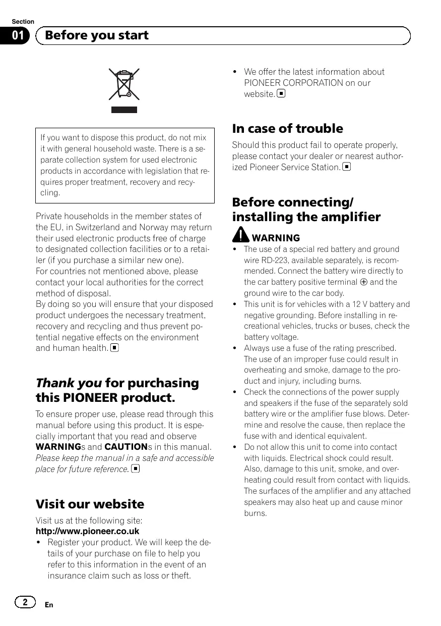 In case of trouble Should this product fail to operate properly, please contact your dealer or nearest authorized Pioneer Service Station. Before connecting/ installing the amplifier WARNING ! The use of a special red battery and ground wire RD-223, available separately, is recommended. Connect the battery wire directly to the car battery positive terminal + and the ground wire to the car body. ! This unit is for vehicles with a 12 V battery and negative grounding. Before installing in recreational vehicles, trucks or buses, check the battery voltage. ! Always use a fuse of the rating prescribed. The use of an improper fuse could result in overheating and smoke, damage to the product and injury, including burns. ! Check the connections of the power supply and speakers if the fuse of the separately sold battery wire or the amplifier fuse blows. Determine and resolve the cause, then replace the fuse with and identical equivalent. ! Do not allow this unit to come into contact with liquids. Electrical shock could result. Also, damage to this unit, smoke, and overheating could result from contact with liquids. The surfaces of the amplifier and any attached speakers may also heat up and cause minor burns. Section Before you start