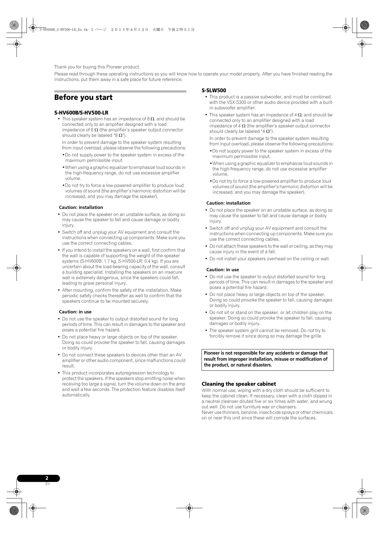 In order to prevent damage to the speaker system resulting from input overload, please observe the following precautions: •Do not supply power to the speaker system in excess of the maximum permissible input. •When using a graphic equalizer to emphasize loud sounds in the high-frequency range, do not use excessive amplifier volume. •Do not try to force a low-powered amplifier to produce loud volumes of sound (the amplifier’s harmonic distortion will be increased, and you may damage the speaker). Caution: installation • Do not place the speaker on an unstable surface, as doing so may cause the speaker to fall and cause damage or bodily injury. • Switch off and unplug your AV equipment and consult the instructions when connecting up components. Make sure you use the correct connecting cables. • If you intend to install the speakers on a wall, first confirm that the wall is capable of supporting the weight of the speaker systems (S-HV600B: 1.7 kg, S-HV500-LR: 0.4 kg). If you are uncertain about the load-bearing capacity of the wall, consult a building specialist. Installing the speakers on an insecure wall is extremely dangerous, since the speakers could fall, leading to grave personal injury. • After mounting, confirm the safety of the installation. Make periodic safety checks thereafter as well to confirm that the speakers continue to be mounted securely. Caution: in use • Do not use the speaker to output distorted sound for long periods of time. This can result in damages to the speaker and poses a potential fire hazard. • Do not place heavy or large objects on top of the speaker. Doing so could provoke the speaker to fall, causing damages or bodily injury. • Do not connect these speakers to devices other than an AV amplifier or other audio component, since malfunctions could result. • This product incorporates autoregression technology to protect the speakers. If the speakers stop emitting noise when receiving too large a signal, turn the volume down on the amp and wait a few seconds. The protection feature disables itself automatically.