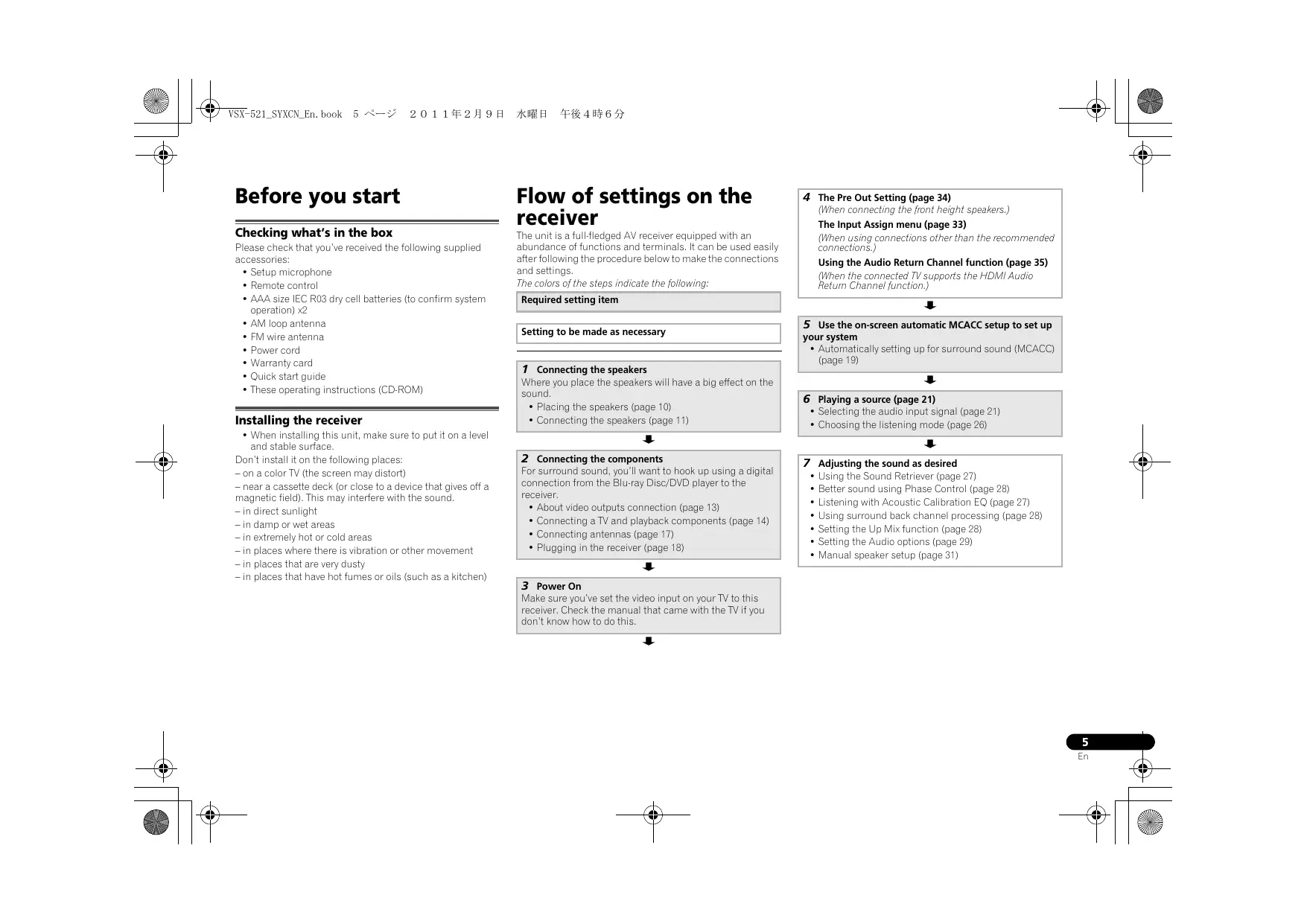 Flow of settings on the receiver The unit is a fullfledged AV receiver equipped with an abundance of functions and terminals. I can be used easily after following the procedure below to makethe connections and settings. The colors of the steps indicate the following: Required setting item Setting to be made as necessary 1 Connecting the speakers Where you place the speakers will have a big effect on the sound. + Placing the speakers (page 10) + Connecting the speakers (page 11)
