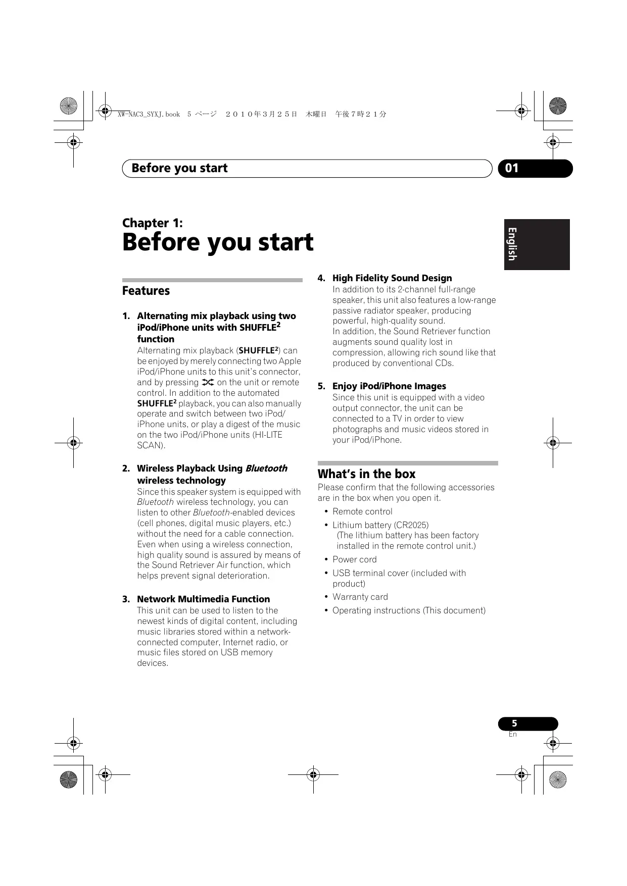 What’s in the box Please confirm that the following accessories are in the box when you open it. • Remote control • Lithium battery (CR2025) (The lithium battery has been factory installed in the remote control unit.) • Power cord • USB terminal cover (included with product) • Warranty card • Operating instructions (This document)