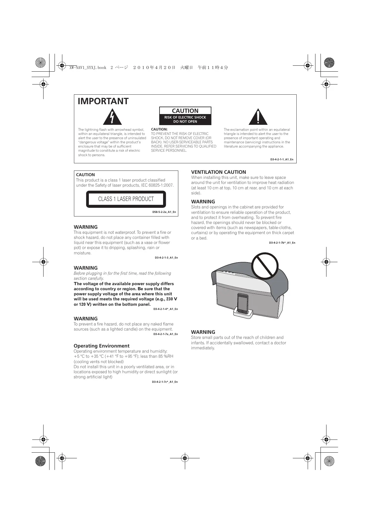 A er Tous droits de reproduction et de traduction réservés. Fr 4 PRECAUCIONES CONCERNIENTES A LA intenciôn de utilizarlo durante much tiempo seguido (por ejemplo, antes de irse de MANIPULACIÔN DEL CABLE DE vacaciones) ALIMENTACION D342-2-28* A1 Es Tome el cable de alimentacién por la clavija. No extraiga la clavija tirando del cable. Nunca toque el cable de alimentacién cuando sus manos estén Este producto es para tareas domésticas mojadas, ya que esto podria causar cortocircuitos o generales. Cualquiera averia debida a otra descargas eléctricas. No coloque la unidad, algün utilizaciôn que tareas domésticas (tales como el mueble, etc., sobre el cable de alimentacién. uso a largo plazo para motivos de negocios en Asegürese de no hacer nudos en el cable ni de unirlo à un restaurante o el uso en un coche o un barco) otros cables. Los cables de alimentacién deberän ser y que necesita una reparacién harä que cobrarla dispuestos de tal forma que la probabilidad de que incluso durant el periodo de garantie. sean pisados sea minima. Una cable de alimentaciôn Koët As dañado podrä causar incendios o descargas eléctricas. Revise el cable de alimentaciôn est dañado, solicite el reemplazo del mismo al centro de servicio autorizado Cuando utilice este producte, confirme la PIONEER mâs cercano, o a su distribuidor informaciôn de seguridad mostrada en la parte sat inferior de la unidad. Daaaaa ere