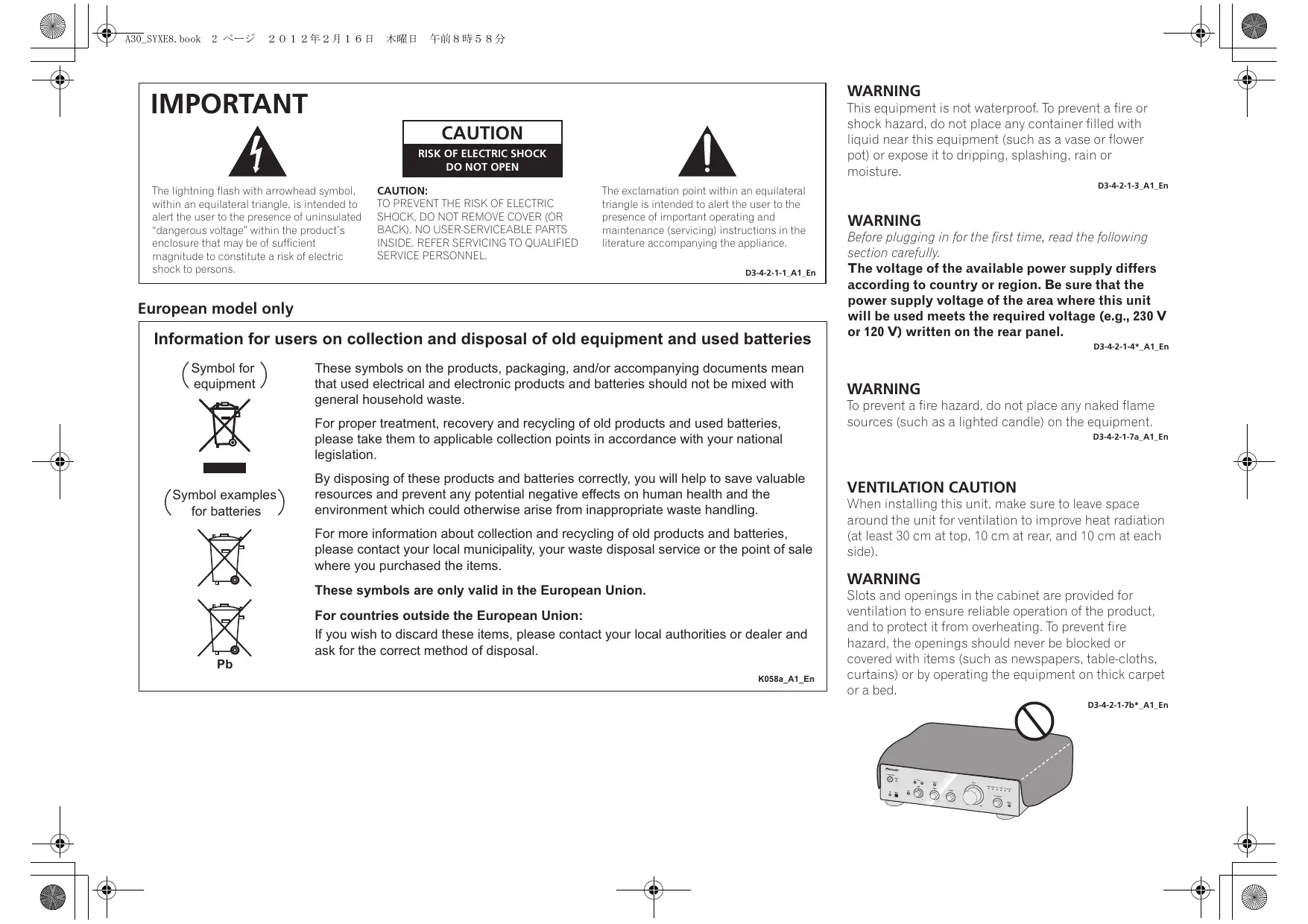 WARNING This equipment is not waterproof, To prevent a fire or shock hazard, do not place any container filled with liquid near this equipment (such as a vase or flower pot) or expose it to dripping, splashing, rain or
