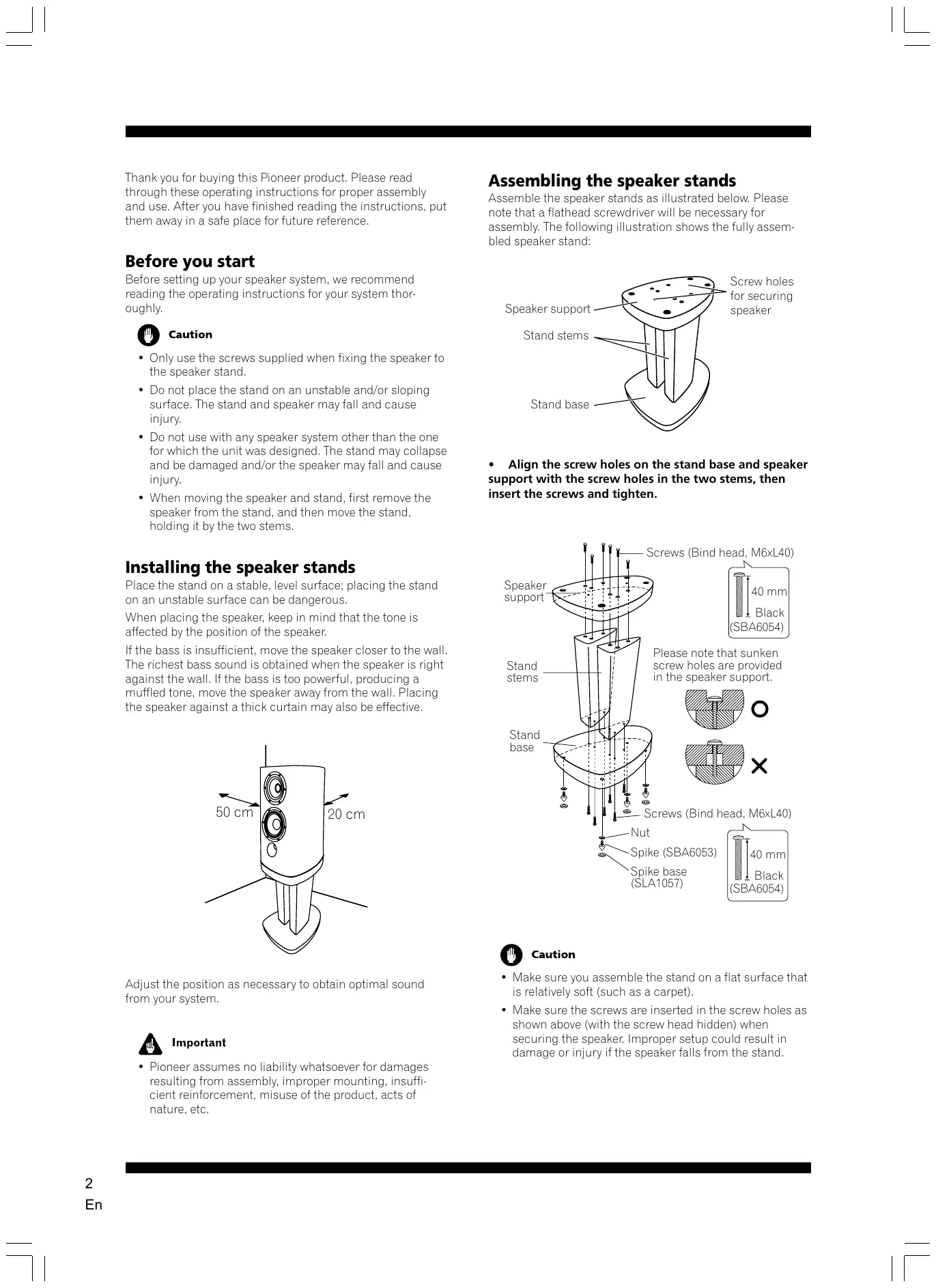 + Pioneer assumes no liability whatsoever for damages resulting from assembly, improper mounting, insuffi- cient reinforcement, misuse of the product, acts of nature, etc.