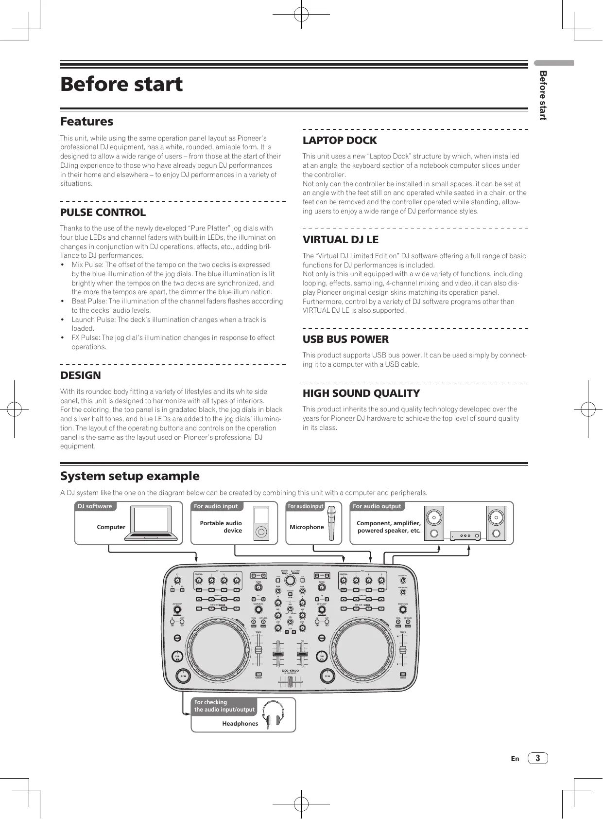Before start Features This unit, while using the same operation panel layout as Pioneer's professional DJ equipment, has a white, rounded, amiable form. It is designed to allow a wide range of users — from those at the start of their Diing experience to those who have already begun DJ performances in their home and elsewhere —to enjoy DJ performances in a variety of situations. PULSE CONTROL Thanks to the use of the newly developed “Pure Platter jog dials with four blue LEDs and channel faders with builtin LED, the illumination changes in conjunction with DJ operations, effects, etc. adding bril liance to DJ performances. Mix Pulse: The offset of the tempo on the two decks is expressed by the blue illumination of the jog dials. The blue illumination is lit brightiy when the tempos on the two decks are synchronized, and the more the tempos are apart, the dimmer the blue illumination Beat Pulse: The illumination of the channel faders flashes according to the decks' audio levels. Launch Pulse: The deck's illumination changes when a track is loaded FX Pulse: The jog dial's illumination changes in response to effect operations. DESIGN With its rounded body fitting a variety of lifestyles and its white side panel, this unit is designed to harmonize with all types of interiors. Forthe coloring, the top panel is in gradated black, the jog dials in black and silver half tones, and blue LEDs are added to the jog dials’ illumina- tion. The layout of the operating buttons and controls on the operation panel is the same as the layout used on Pioneer's professional DJ equipment. yejs 21079g | This unit uses a new “Laptop Dock” structure by which, when installed at an angle, the keyboard section of a notebook computer slides under the controller. Not only can the controller be installed in small spaces, it can be set at an angle with the feet still on and operated while seated in a chair, or the feet can be removed and the controller operated while standing, allow ing users to enjoy a wide range of DJ performance styles. VIRTUAL The “Virtual DJ Limited Edition" DJ software offering a full range of basic functions for DJ performances is included. Not only is this unit equipped with a wide variety of functions, including looping, effects, sampling, 4-channel mixing and video, it can also dis- play Pioneer original design skins matching its operation panel. Furthermore, control by a variety of DJ software programs other than VIRTUAL DJ LE is also supported. DJLE POWER USB BUS This product supports USB bus power. It can be used simply by connect: ing it to a computer with a USB cable HIGH SOU This product inherits the sound quality technology developed over the years for Pioneer DJ hardware to achieve the top level of sound quality in its class. ND QUALITY System setup example A DJ system like the one on the diagram belowr can be created by combining this unit with a computer and peripherals. For audio input Portable audio Computer die For audio output Component, amplifier, powered speaker, etc.