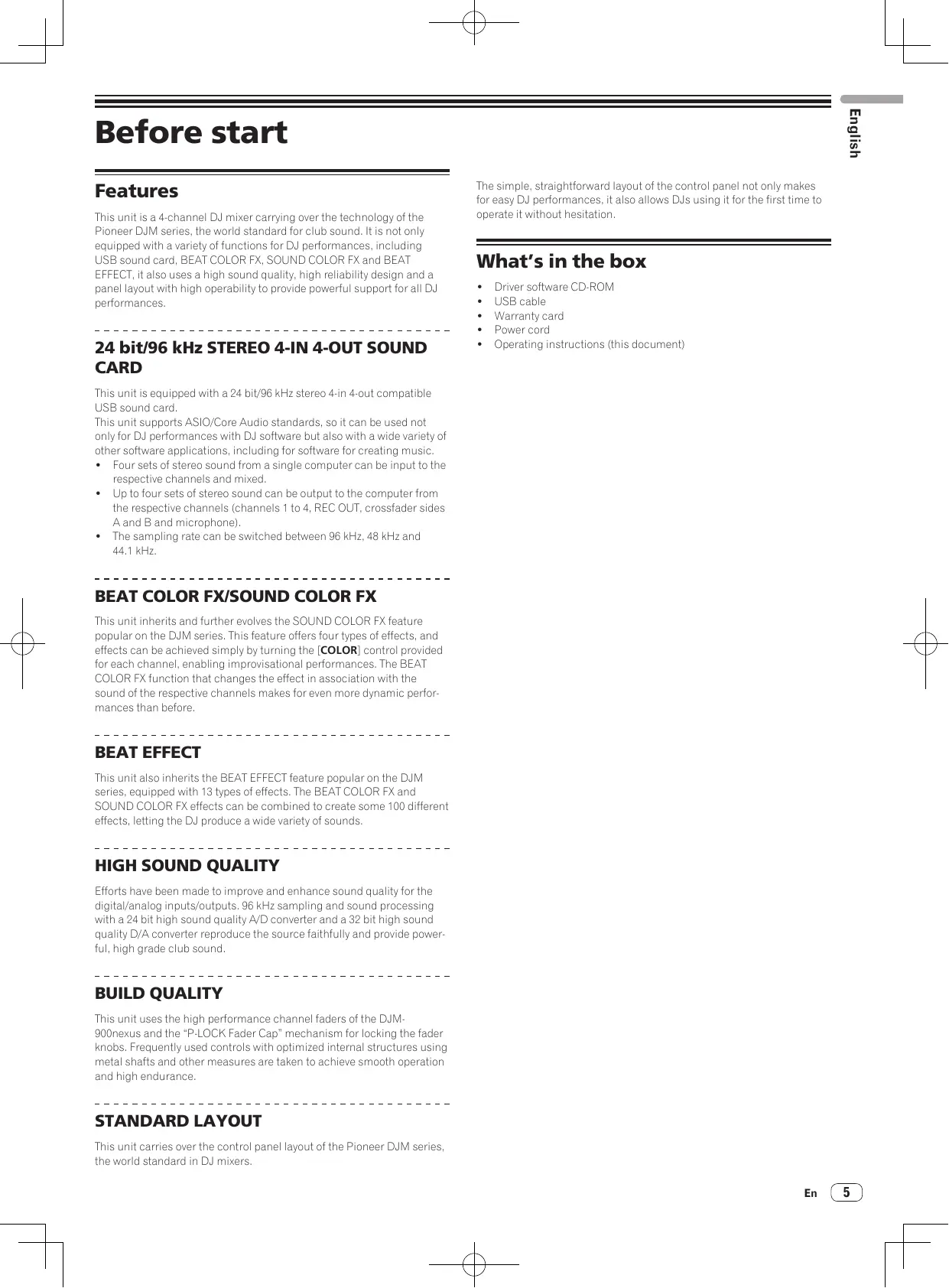 English Before start Features This unit is a 4-channel DJ mixer carrying over the technology of the Pioneer DJM series, the world standard for club sound. It is not only equipped with a variety of functions for DJ performances, including USB sound card, BEAT COLOR FX, SOUND COLOR FX and BEAT EFFECT, it also uses a high sound quality, high reliability design and a panel layout with high operability to provide powerful support for all DJ performances. 24 bit/96 kHz STEREO 4-IN 4-OUT SOUND CARD The simple, straightforward layout of the control panel not only makes for easy DJ performances, it also allows DJs using it for the first time to operate it without hesitation. What’s in the box