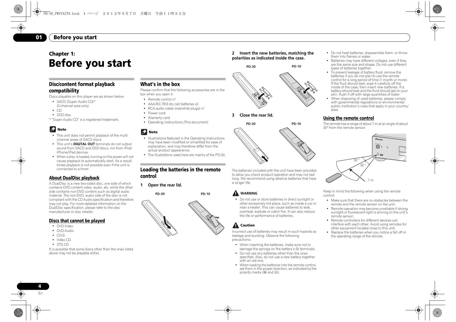 D58.5-2-2a A1_En Contents 01 Before you start Disc/content format playback compatibility. What's in the box... Loading the batteries in the remote control . Using the remote control 02 Connecting up Analog audio output connections Digital audio output connections. Using centralized control with other Pioneer components (PD-30 only) . Plugging in 03 Controls and Remote control Rear panel. Front panel . Front panel display 04 Playback Playing discs Set the power to Standb) Fast fonvard/Fast reverse Skip function Direct search {designate a specific track for playback). Repeat playback . Random playback Programmed playback (Play tracks in a predetermined order) . View disc data . iPod/iPhone/iPad playback {PD-30 only) Confirm what iPad/iPhone/iPad models are supported Playing your iPod/iPhone/iPad Playing files stored on USB storage devices 05 Using advanced fun Playing with high-fidelity sound. Sound Retriever. Pure Audio … Changing the playback area (layer) of an SACD/CD Adjusting overall display illumination . Auto power down (automatically sets power to SUDa standb) 11 Playback functions 11 06 Additional Playable disc … 12 Playable file formats . Cautions on us: Troubleshooting, Specifications .........................