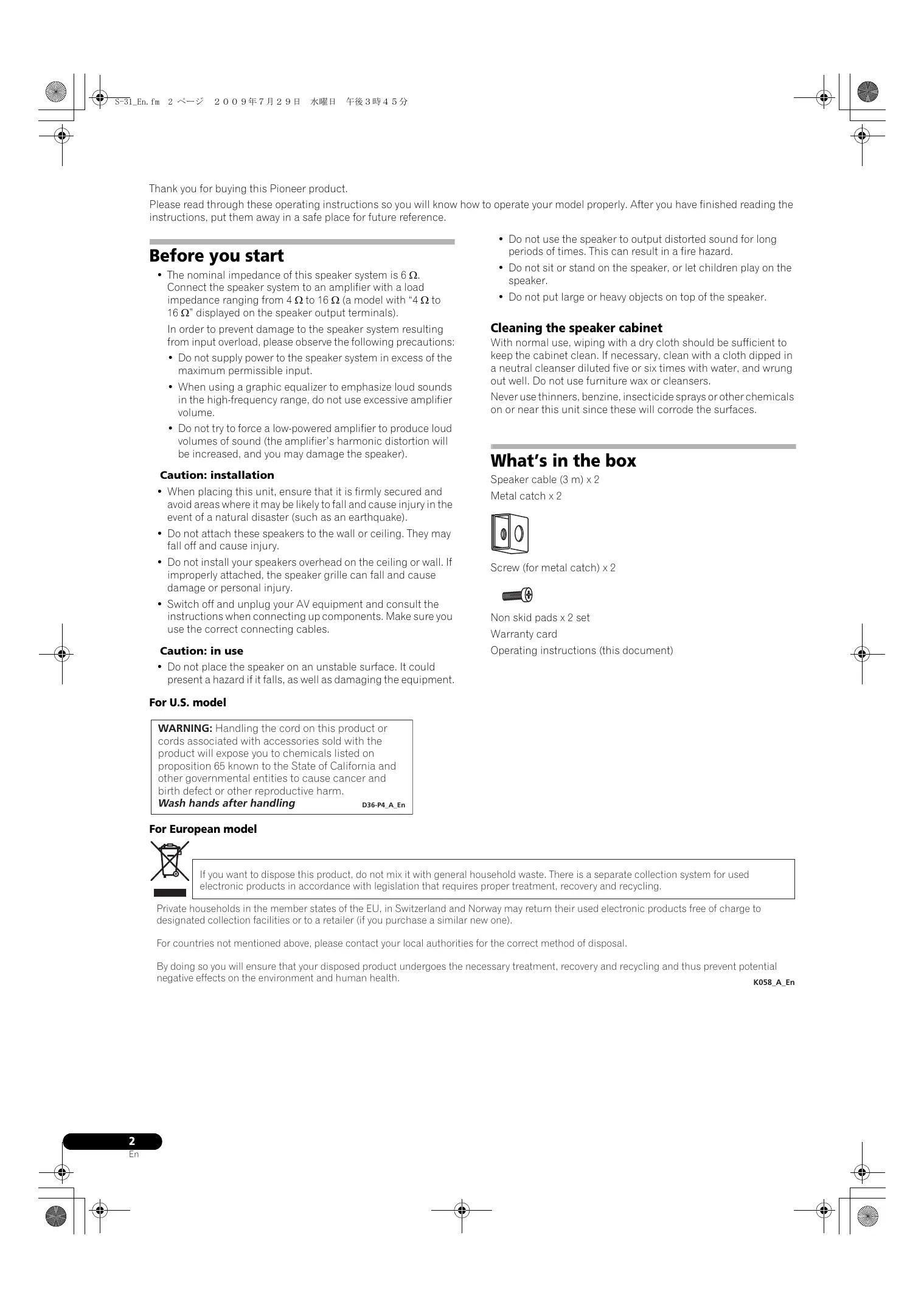 For U.S. model WARNING: Handling the cord on this product or cords associated with accessories sold with the product will expose you to chemicals listed on proposition 65 known to the State of California and other governmental entities to cause cancer and birth defect or other reproductive harm. Wash hands after handling D36-P4_A_En