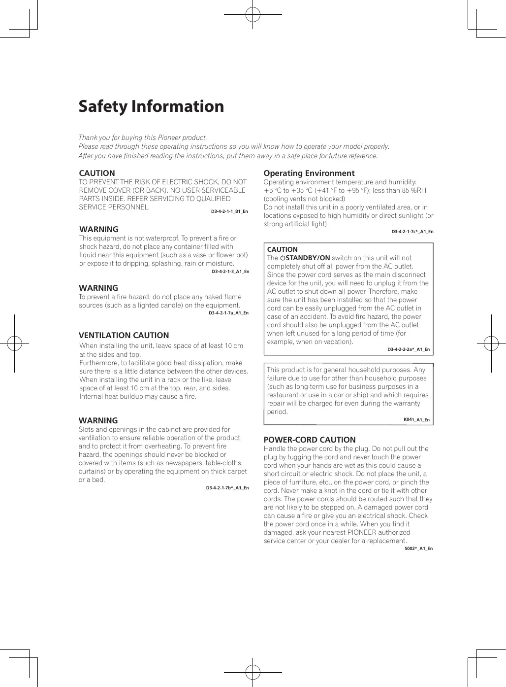 POWER-CORD CAUTION Handle the power cord by the plug. Do not pull out the plug by tugging the cord and never touch the power cord when your hands are wet as this could cause a short circuit or electric shock. Do not place the unit, a piece of furniture, etc., on the power cord, or pinch the cord. Never make a knot in the cord or tie it with other cords. The power cords should be routed such that they are not likely to be stepped on. A damaged power cord can cause a fire or give you an electrical shock. Check the power cord once in a while. When you find it damaged, ask your nearest PIONEER authorized service center or your dealer for a replacement. S002*_A1_En