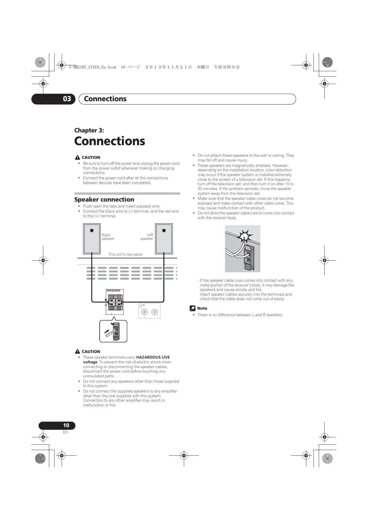 - Do not allow the speaker cable core to come into contact with the receiver body. Left speaker Right speaker This unit’s rear panel - If the speaker cable core comes into contact with any metal portion of the receiver’s body, it may damage the speakers and cause smoke and fire. Insert speaker cables securely into the terminals and check that the cable does not come out of easily. SPEAKERS LINE Note