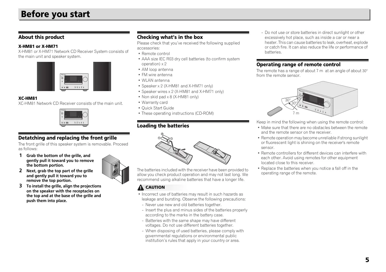 on the speaker with the receptacles on the top and at the base of the grille and push them into place. Checking what's in the box Please check that you've received the following supplied accessories: + Remote control + AAA size IEC RO3 dry cell batteries (to contirm system operation) x 2 + AM loop antenna + FM wire antenna + WLAN antenna + Speaker x 2 (X-HMB1 and XHM71 only) + Speaker wires x 2 (CHMB1 and X-HMT1 only) + Non skid pad x 8 (LHM81 only) + Warranty card + Quick Start Guide + These operating instructions (CD-ROM) Loading the batteries