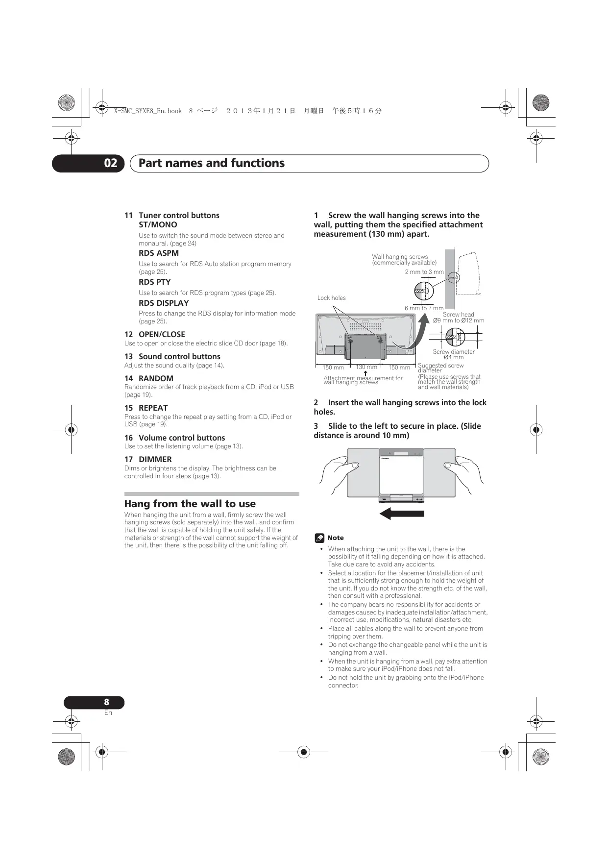 Part names and functions 11 Tuner control buttons ST/MONO Use to switch the sound mode between stereo and monaural. (page 24) 1 Screw the wall hanging screws into the wall, putting them the specified attachment measurement (130 mm) apart. RDS ASPM Wall hanging screws (commercially available) 2 mm to 3 mm Use to search for RDS Auto station program memory (page 25). RDS PTY Use to search for RDS program types (page 25). RDS DISPLAY Lock holes 6 mm to 7 mm Screw head ø9 mm to ø12 mm Press to change the RDS display for information mode (page 25). 12 OPEN/CLOSE Use to open or close the electric slide CD door (page 18). DC IN Screw diameter ø4 mm Suggested screw diameter (Please use screws that match the wall strength and wall materials) ANTENNA 13 Sound control buttons Adjust the sound quality (page 14). 150 mm 14 RANDOM Attachment measurement for wall hanging screws Randomize order of track playback from a CD, iPod or USB (page 19). 15 REPEAT Press to change the repeat play setting from a CD, iPod or USB (page 19). 16 Volume control buttons 130 mm 150 mm 2 Insert the wall hanging screws into the lock holes. 3 Slide to the left to secure in place. (Slide distance is around 10 mm) Use to set the listening volume (page 13). 17 DIMMER POWER ON TIMER Dims or brightens the display. The brightness can be controlled in four steps (page 13). PUSH OPEN Hang from the wall to use When hanging the unit from a wall, firmly screw the wall hanging screws (sold separately) into the wall, and confirm that the wall is capable of holding the unit safely. If the materials or strength of the wall cannot support the weight of the unit, then there is the possibility of the unit falling off.