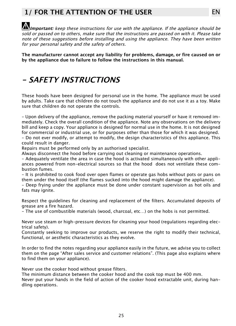 Important: keep these instructions for use with the appliance. If the appliance should be sold or passed on to others, make sure that the instructions are passed on with it. Please take note of these suggestions before installing and using the appliance. They have been written for your personal safety and the safety of others.