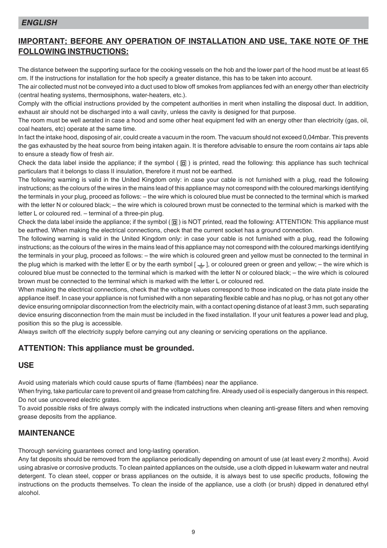 To avoid possible risks of fire always comply with the indicated instructions when cleaning anti-grease filters and when removing grease deposits from the appliance.