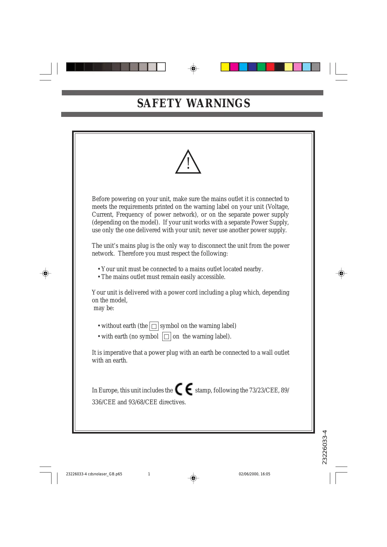 - The mains outlet must remain easily accessible. Your unit is delivered with a power cord including a plug which, depending on the model, may be: without earth (the (a) symbol on the warning label) + with earth (no symbol (o] on the warning label). Itis imperative that a power plug with an earth be connected to a wall outlet with an earth. In Europe, this unit includes the C € stamp, following the 73/23/CEE, 89/ 336/CEE and 93/68/CEE directives. 02/06/2000, 16:05 23226033-4
