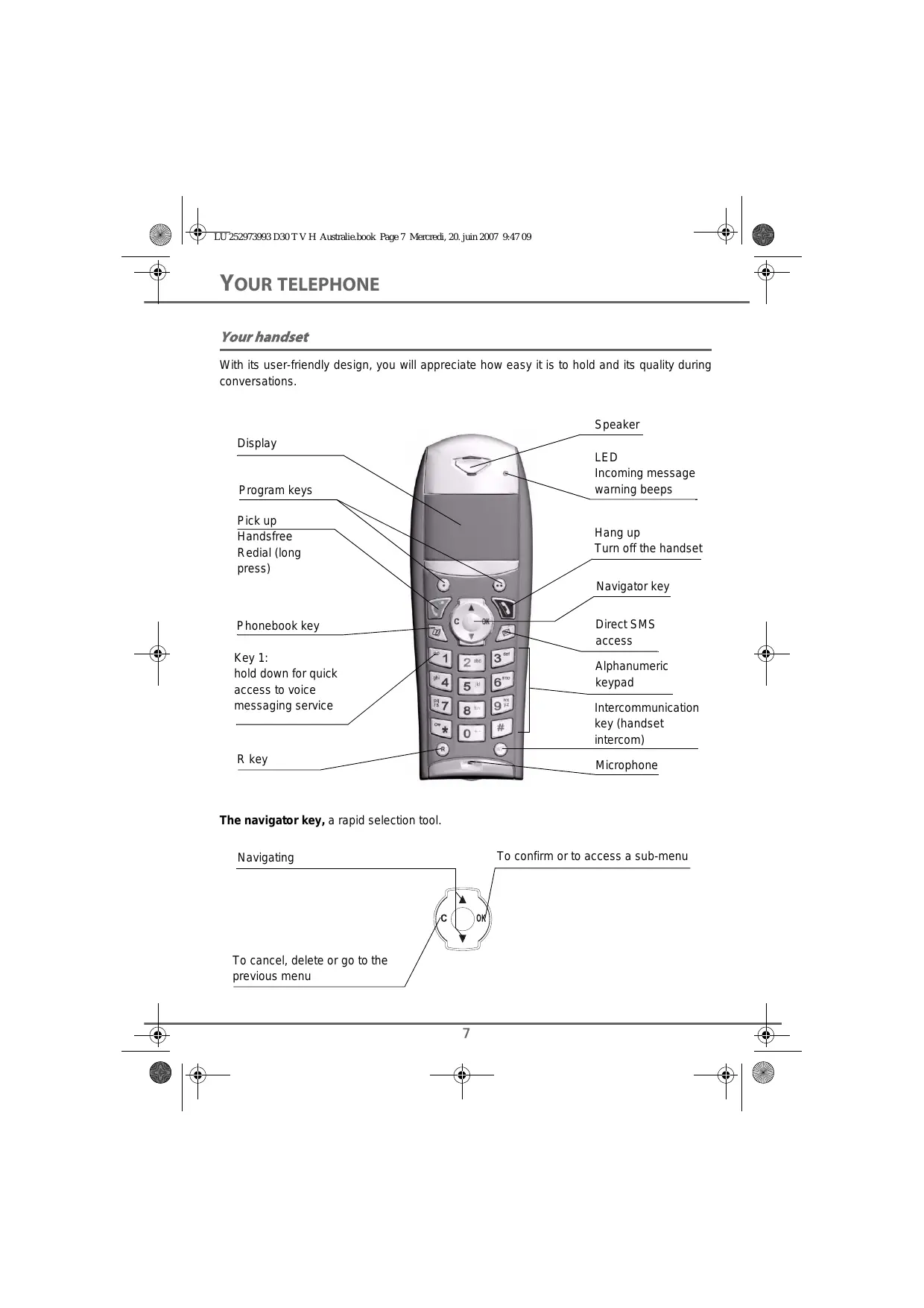 PS & & | TU252973993 D30 T V H Australiebook Page 7 Mercredi, 20. juin 2007 9:47 09 & $ YOUR TELEPHONE ° Your handset With its user-friendly design, you will appreciate how easy it is to hold and its quality during conversations. Speaker Display LED Incoming message Program keys waming beeps Pick up Handsfree Redial (long press) Hang up Turn off the handset Navigator key