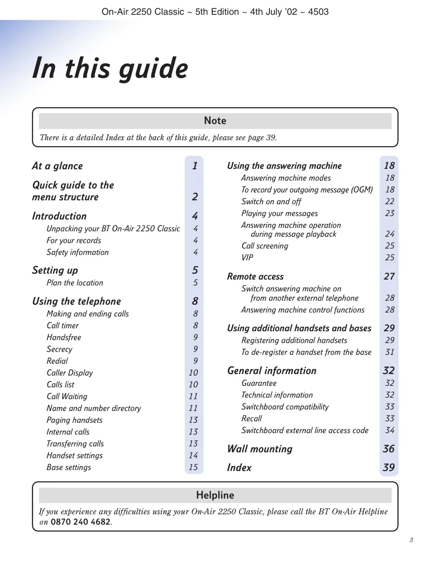 On-Air 2250 Classic - 5th Edition - 4th July 02 - 4503 In this guide Note There is a detailed Index at the back of this guide, please see page 39. At a glance 1 Using the answering machine 18 . . Answering machine modes 18 Quick guide to the a To record your outgoing message (OGM) 18 menu structure Switch on and off 22 Introduction 4 Playing your messages 23 Ai Answering machine operation Unpacking your BT On-Air 2250 Classic 4 during message playback 24 For your records 4 s A ; Cal! screening 25 afety information P 55 Setting u 5 9 UP Remote access 27 Plan the location 5 Switch answering machine on Using the telephone 8 from another external telephone 28 Making and ending calls 8 Answering machine control functions 28 Call timer 8 Using additional handsets and bases 29 Handsfree 9 Registering additional handsets 29 Secrey 9 To de-register a handset from the base 31 Redial 9 Caller Display 10 General information 32 Calls list 10 Guarantee 32 Call Waiting 11 Technical information 32 Name and number directory 11 Switchboard compatibility 33 Paging handsets 15 Recall 33 Internal calls 13 Switchboard external line access code 34 Transferring calls 13 we à all mountin, 36 Handset settings 14 dl Base settings 15 Index 39 Helpline If you experience any difficulties using your On-Air 2250 Classic, please call the BT On-Air Helpline on 0870 240 4682.