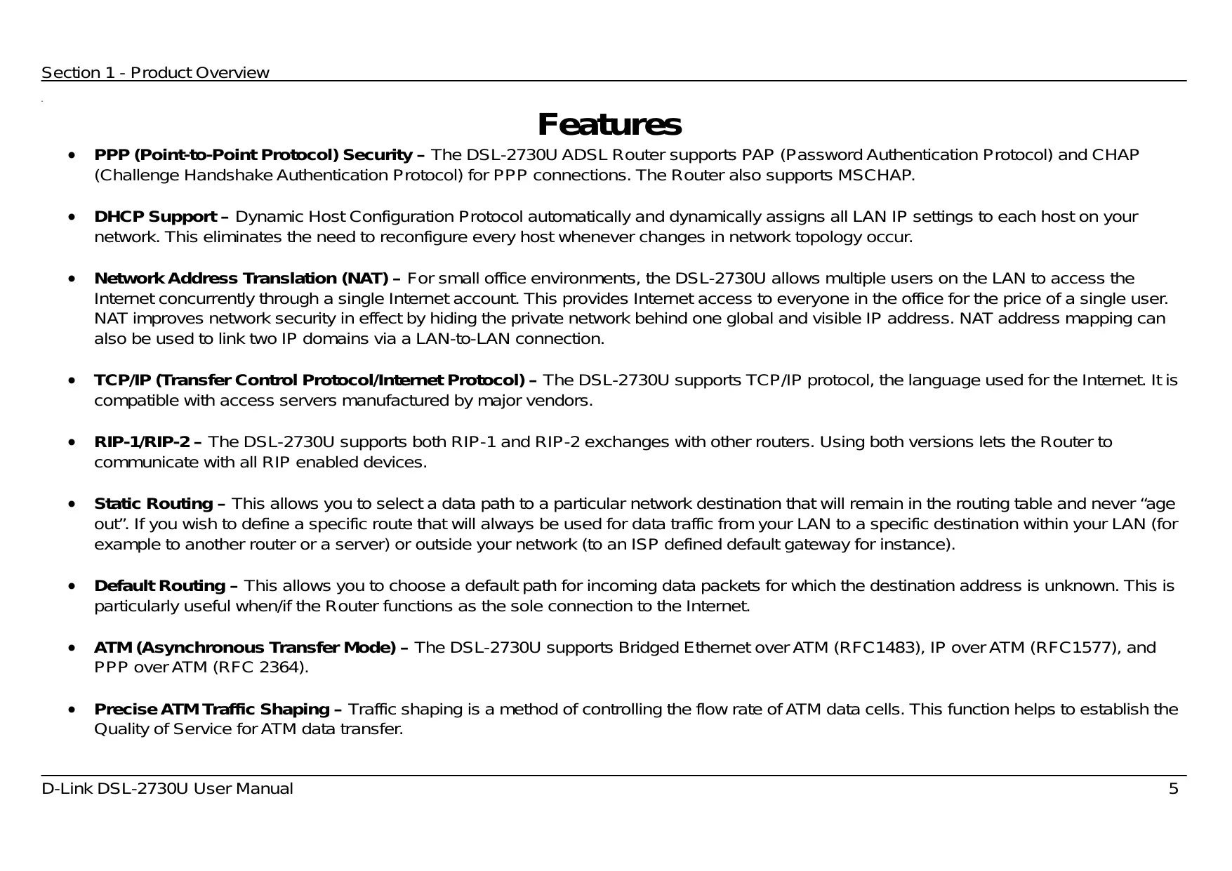 ATM (Asynchronous Transfer Mode) – The DSL-2730U supports Bridged Ethernet over ATM (RFC1483), IP over ATM (RFC1577), and PPP over ATM (RFC 2364).