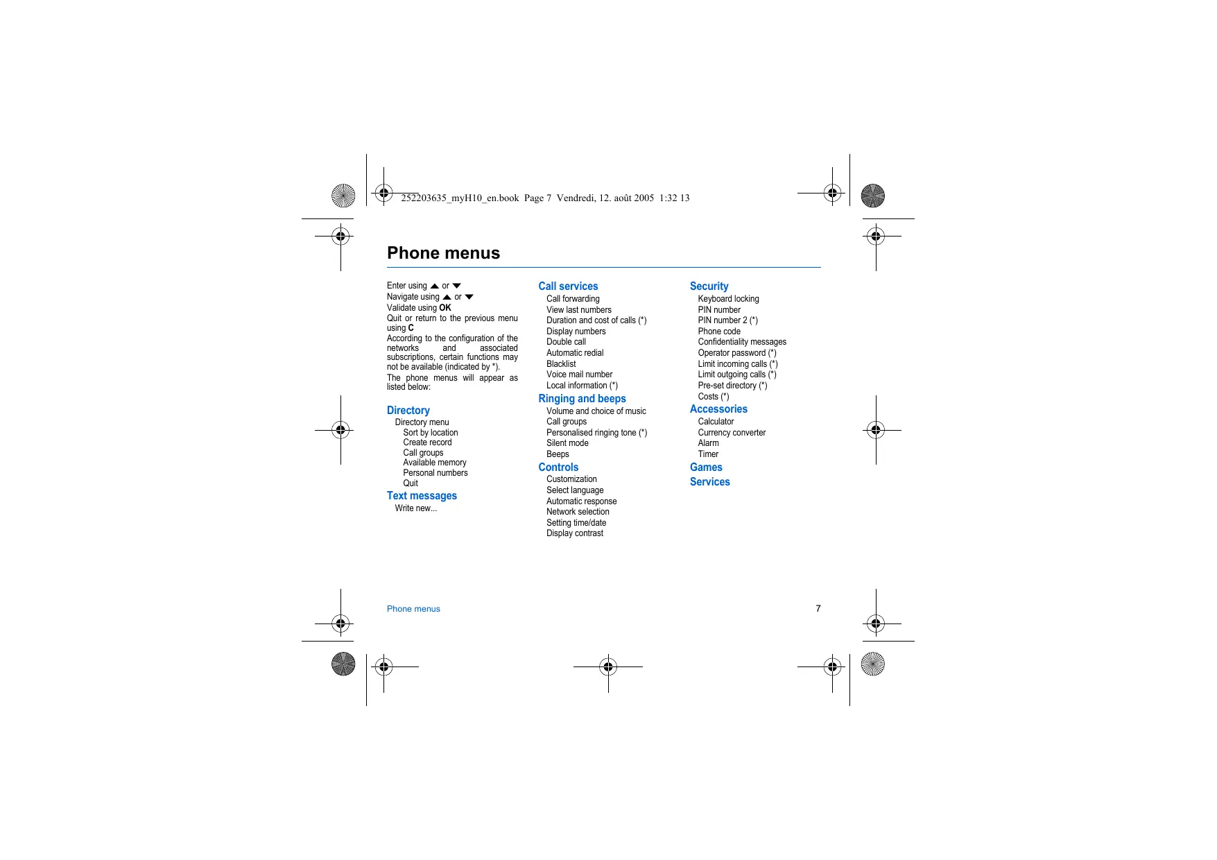 Enter using À or w Call services Security Navigate using A or w Cal forwarding Keyboard locking Validate using OK View last numbers PIN number Quit or return to the previous menu Duration and cost of call (*) PIN number 2 (+) using C Display numbers Phone code Accordng to the canfiguraton of he Double call Confidentiaity messages subscnptions, certain functions may Automate redial (Operator password () not be available (indicated by *). Blackist Limit incoming call (°) Tre phone menus will appear as Voice mail number Limit outgoing cals (*) listed below Local information () Pre-set directory (*) Ringing and beeps Costs()_ Directory Volume and choice of music Accessories r Directory menu Cal groups Calculator /- NA Sor by location Personalsed rnging tone (*) Currency converter 2 Create record Silent mode Alerm ga gas Beeps Timer vailéble mem Personal Heu Controls Games Qu Customization Services