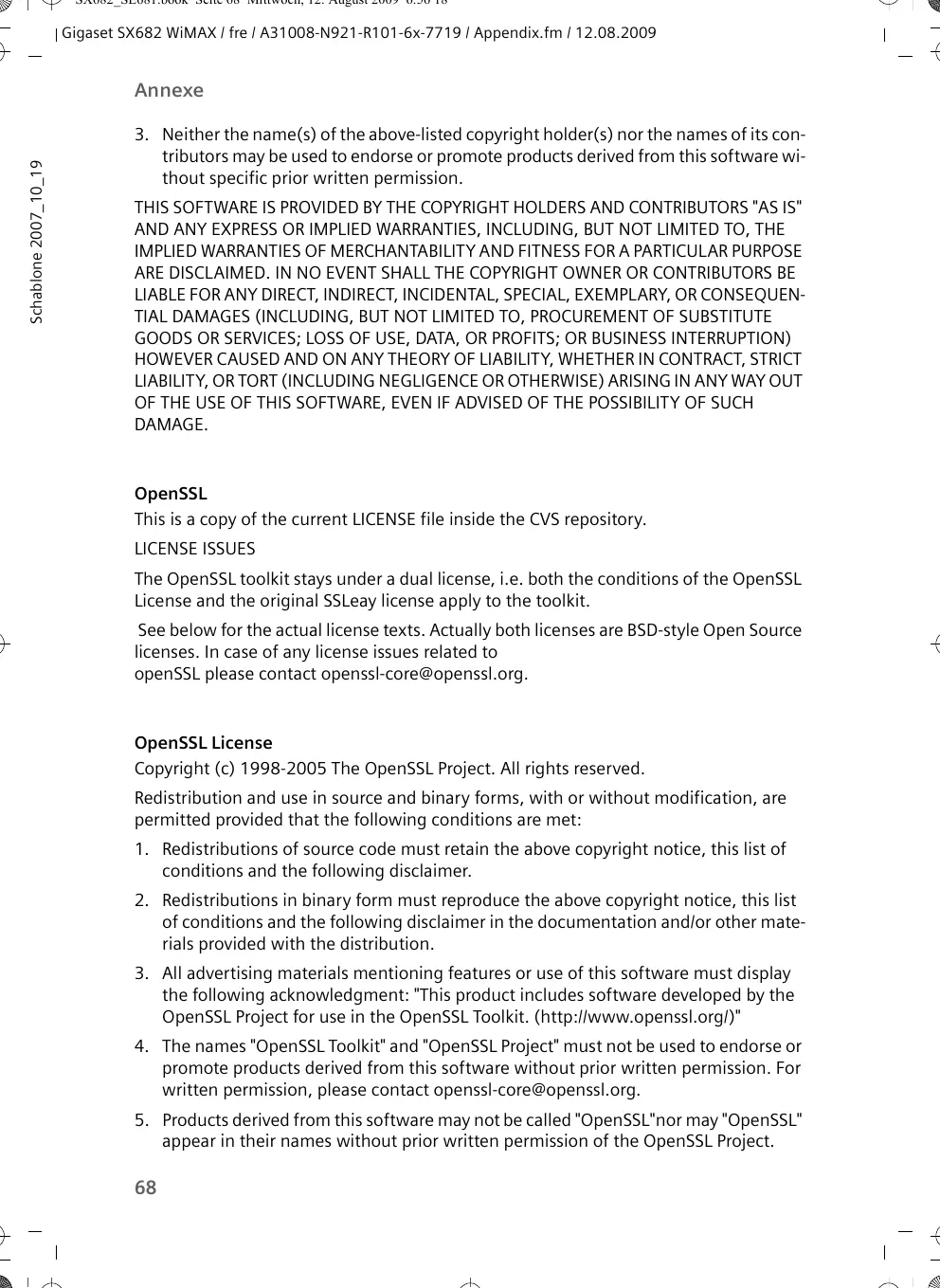 SX682_SE681.book Seite 68 Mittwoch, 12. August 2009 6:56 18 Gigaset SX682 WiMAX / fre / A31008-N921-R101-6x-7719 / Appendix.fm / 12.08.2009 Schablone 2007_10_19 Annexe 3. Neither the name(s) of the above-listed copyright holder(s) nor the names of its contributors may be used to endorse or promote products derived from this software without specific prior written permission. THIS SOFTWARE IS PROVIDED BY THE COPYRIGHT HOLDERS AND CONTRIBUTORS "AS IS" AND ANY EXPRESS OR IMPLIED WARRANTIES, INCLUDING, BUT NOT LIMITED TO, THE IMPLIED WARRANTIES OF MERCHANTABILITY AND FITNESS FOR A PARTICULAR PURPOSE ARE DISCLAIMED. IN NO EVENT SHALL THE COPYRIGHT OWNER OR CONTRIBUTORS BE LIABLE FOR ANY DIRECT, INDIRECT, INCIDENTAL, SPECIAL, EXEMPLARY, OR CONSEQUENTIAL DAMAGES (INCLUDING, BUT NOT LIMITED TO, PROCUREMENT OF SUBSTITUTE GOODS OR SERVICES; LOSS OF USE, DATA, OR PROFITS; OR BUSINESS INTERRUPTION) HOWEVER CAUSED AND ON ANY THEORY OF LIABILITY, WHETHER IN CONTRACT, STRICT LIABILITY, OR TORT (INCLUDING NEGLIGENCE OR OTHERWISE) ARISING IN ANY WAY OUT OF THE USE OF THIS SOFTWARE, EVEN IF ADVISED OF THE POSSIBILITY OF SUCH DAMAGE. OpenSSL This is a copy of the current LICENSE file inside the CVS repository. LICENSE ISSUES The OpenSSL toolkit stays under a dual license, i.e. both the conditions of the OpenSSL License and the original SSLeay license apply to the toolkit. See below for the actual license texts. Actually both licenses are BSD-style Open Source licenses. In case of any license issues related to openSSL please contact openssl-core@openssl.org. OpenSSL License Copyright (c) 1998-2005 The OpenSSL Project. All rights reserved. Redistribution and use in source and binary forms, with or without modification, are permitted provided that the following conditions are met:
