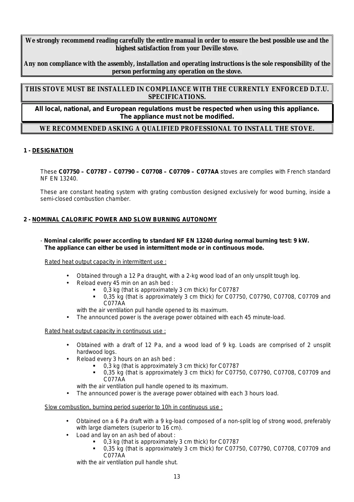 We strongly recommend reading carefully the entire manual in order to ensure the best possible use and the highest satisfaction from your Deville stove. Any non compliance with the assembly, installation and operating instructions is the sole responsibility of the person performing any operation on the stove. THIS STOVE MUST BE INSTALLED IN COMPLIANCE WITH THE CURRENTLY ENFORCED D.T.U. SPECIFICATIONS. All local, national, and European regulations must be respected when using this appliance. The appliance must not be modified. WE RECOMMENDED ASKING A QUALIFIED PROFESSIONAL TO INSTALL THE STOVE.