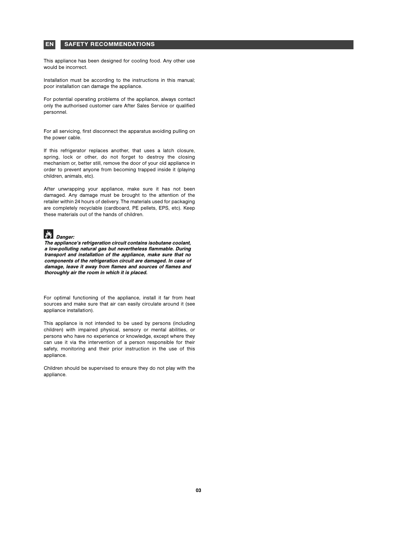 The appliance's refrigeration circuit contains isobutane coolant, a low-polluting natural gas but nevertheless flammable. During transport and installation of the appliance, make sure that no components of the refrigeration circuit are damaged. In case of damage, leave it away from flames and sources of flames and thoroughly air the room in which it is placed.