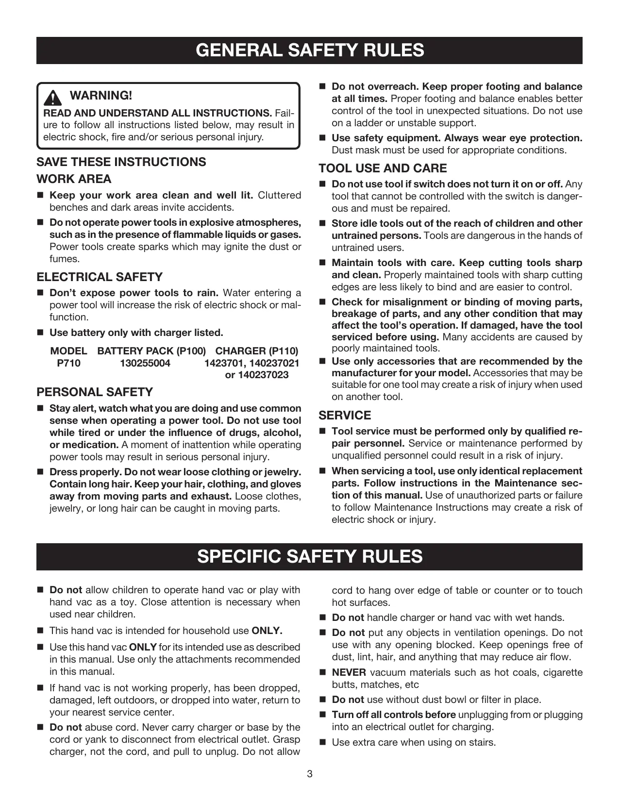 Upon removal, cover the battery pack's terminals with heavy-duty adhesive tape. Do not attempt to destroy or disassemble battery pack or remove any of its components. Nickel-cadmium batteries must be recycled or disposed of properly. Also, never touch both terminals with metal objects and/or body parts as short circuit may result. Keep away from children. Failure to comply with these warnings could result in fire and/or serious injury.