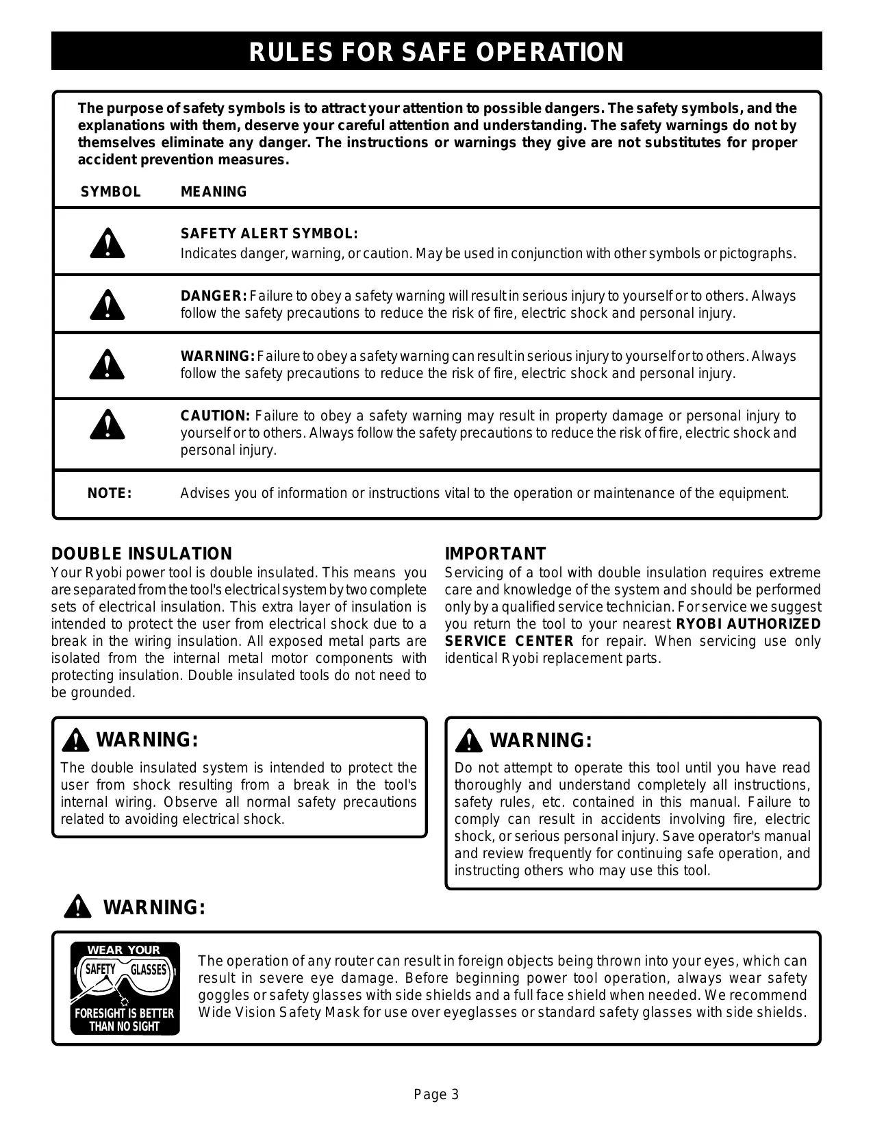 follow the safety precautions to reduce the risk of fire, electric shock and personal injury. CAUTION: Failure to obey a safety warning may result in property damage or personal injury to yourself or to others. Always follow the safety precautions to reduce the risk offire, electric shock and personal injury. Advises you of information or instructions vital to the operation or maintenance of the equipment. DOUBLE INSULATION Your R yobi power tool is double insulated. This means you are separated fromthe tool's electricalsystem bytwo complete sets of electrical insulation. This extra layer of insulation is intended to protect the user from electrical shock due to a break in the wiring insulation. AÏl exposed metal parts are isolated from the internal metal motor components with protecting insulation. Double insulated tools do not need to be grounded. IMPORTANT Servicing of a tool with double insulation requires extreme care and knowledge of the system and should be performed only by a qualified service technician. For service we suggest you return the tool to your nearest RYOBI AUTHORIZED SERVICE CENTER for repair. When servicing use only identical R yobi replacement parts. À WARNING: The double insulated system is intended to protect the user from shock resulting from a break in the tool's internal wiring. Observe all normal safety precautions related to avoiding electrical shock. À WARNING: À WARNING: Do not attempt to operate this tool until you have read thoroughly and understand completely all instructions, safety rules, etc. contained in this manual. Failure to comply can result in accidents involving fire, electric Shock, or serious personal injury. Save operator's manual and review frequently for continuing safe operation, and instructing others who may use this tool. WEAR YOUR The operation of any router can result in foreign objects being thrown into your eyes, which can result in severe eye damage. Before beginning power tool operation, always wear safety goggles or safety glasses with side shields and a full face shield when needed. We recommend Wide Vision Safety Mask for use over eyeglasses or standard safety glasses with side shields. Page 3