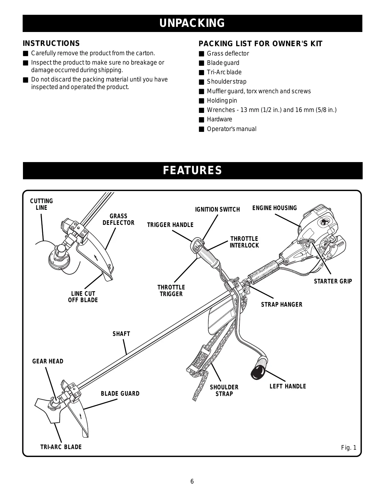 Inspect the unit before each use for loose fasteners, fuel leaks, etc. Replace any damaged parts before use.