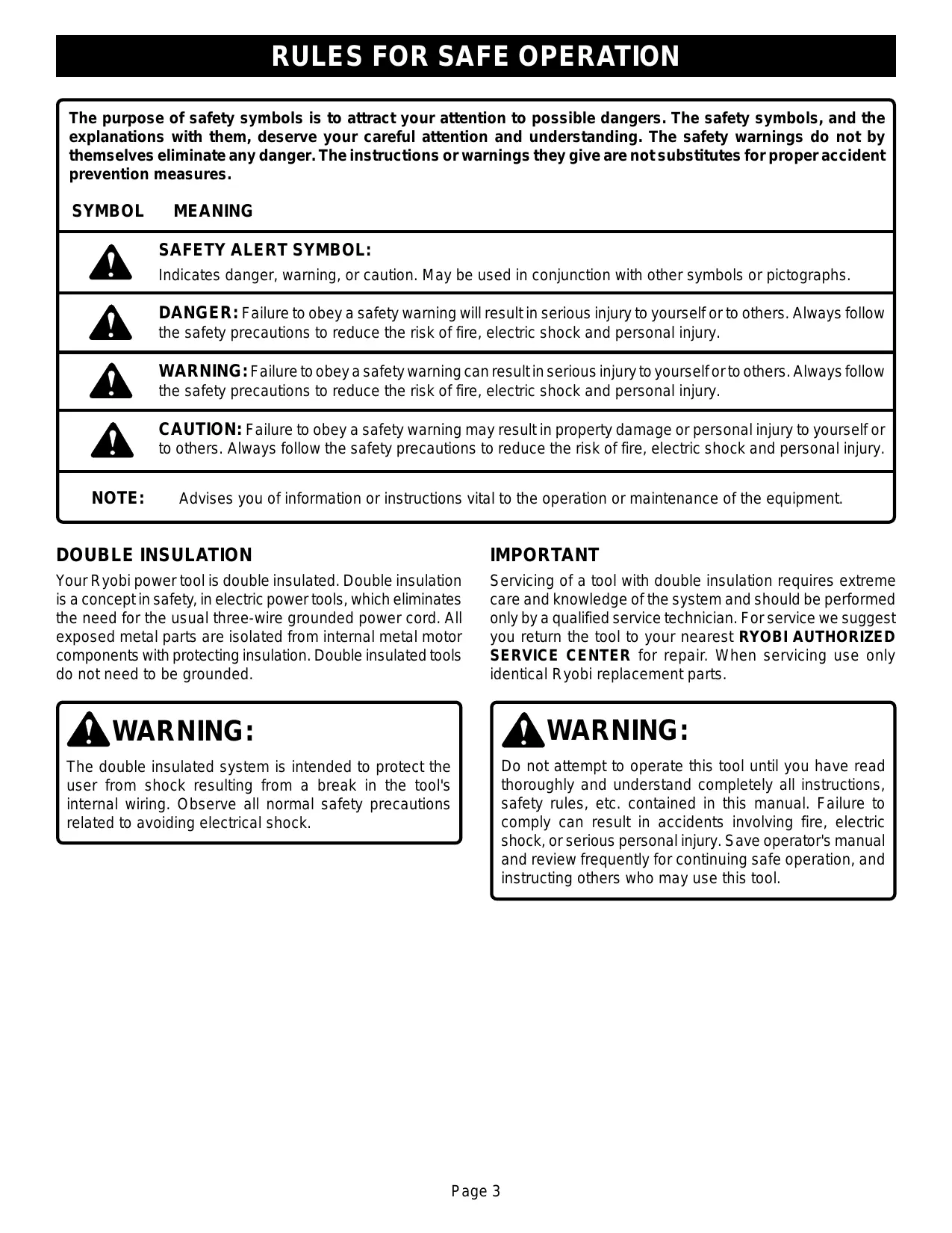 CAUTION: Failure to obey a safety warning may result in property damage or personal injury to yourself or to others. Always follow the safety precautions to reduce the risk of fire, electric shock and personal injury. NOTE: Advises you of information or instructions vital to the operation or maintenance of the equipment. DOUBLE INSULATION Your R yobi power tool is double insulated. Double insulation is a conceptin safety, in electric power tools, which eliminates the need for the usual three-wire grounded power cord. All exposed metal parts are isolated from internal metal motor components with protecting insulation. Double insulated tools do not need to be grounded. IMPORTANT Servicing of a tool with double insulation requires extreme care and knowledge ofthe system and should be performed only by a qualified service technician. For service we suggest you return the tool to your nearest RYOBI AUTHORIZED SERVICE CENTER for repair. When servicing use only identical R yobi replacement parts. À WARNING: The double insulated system is intended to protect the user from shock resulting from a break in the tool's internal wiring. Observe all normal safety precautions related to avoiding electrical shock. À WARNING: Do not attempt to operate this tool until you have read thoroughly and understand completely all instructions, safety rules, etc. contained in this manual. Failure to comply can result in accidents involving fire, electric shock, or serious personal injury. S ave operator's manual and review frequently for continuing safe operation, and instructing others who may use this tool. Page 3
