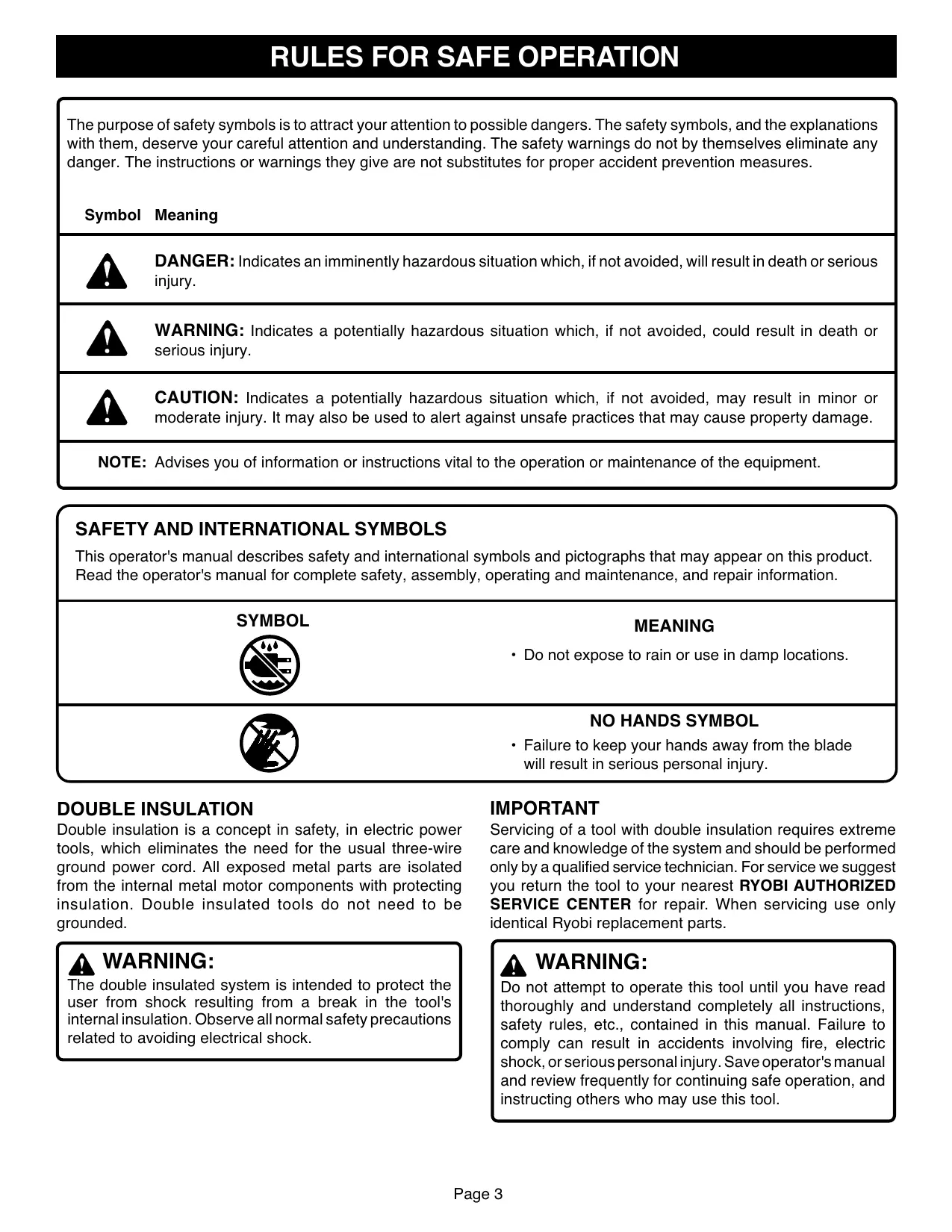 DOUBLE INSULATION Double insulation is a concept in safety, in electric power tools, which eliminates the need for the usual three-wire ground power cord. All exposed metal parts are isolated from the internal metal motor components with protecting insulation. Double insulated tools do not need to be grounded. IMPORTANT Servicing of a tool with double insulation requires extreme care and knowledge of the system and should be performed only by a qualified service technician. For service we suggest you return the tool to your nearest RYOBI AUTHORIZED SERVICE CENTER for repair. When servicing use only identical Ryobi replacement parts. À WARNING: The double insulated system is intended to protect the user from shock resulting from a break in the tool's internal insulation. Observe all normal safety precautions related to avoiding electrical shock. À WARNING: Do not attempt to operate this tool until you have read thoroughly and understand completely all instructions, safety rules, etc., contained in this manual. Failure to comply can result in accidents involving fire, electric shock, or serious personalinjury. Save operator's manual and review frequently for continuing safe operation, and instructing others who may use this tool. Page 3