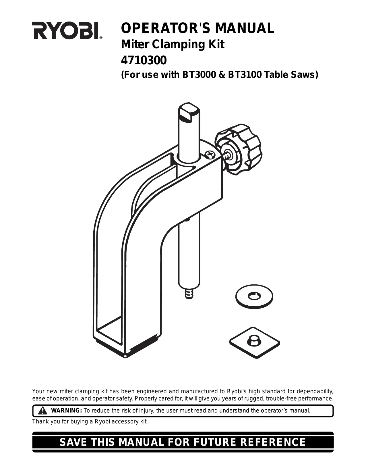 Your new miter clamping kit has been engineered and manufactured to Ryobi's high standard for dependability, ease of operation, and operator safety. Properly cared for, it will give you years of rugged, trouble-free performance.