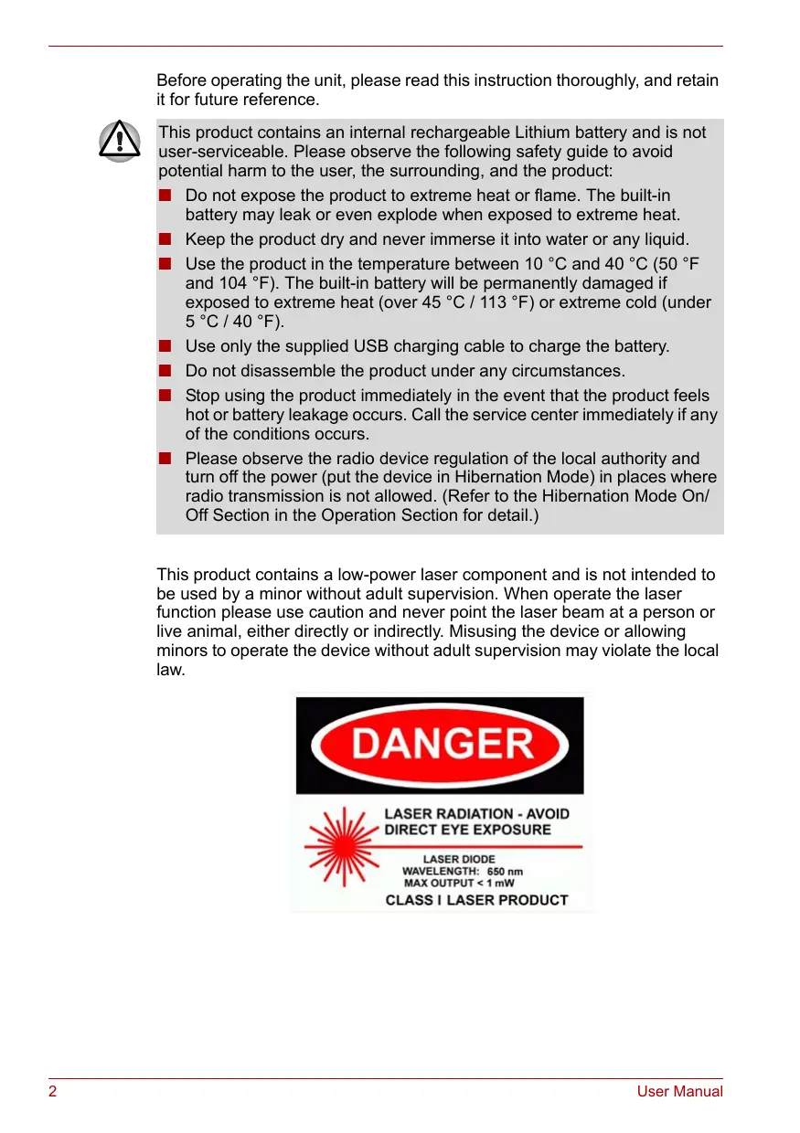Ce produit contient un émetteur laser à faible puissance et n'est pas destiné à être utilisé par un mineur hors de la surveillance d'un adulte. Lors de l’utilisation de la fonction laser, agissez avec précaution et ne pointez jamais le faisceau laser vers une personne ou un animal, directement ou indirectement. Toute utilisation inappropriée de l'appareil, ou toute utilisation de cet appareil par un mineur hors de la surveillance d'un adulte, peut constituer une violation de la réglementation locale.