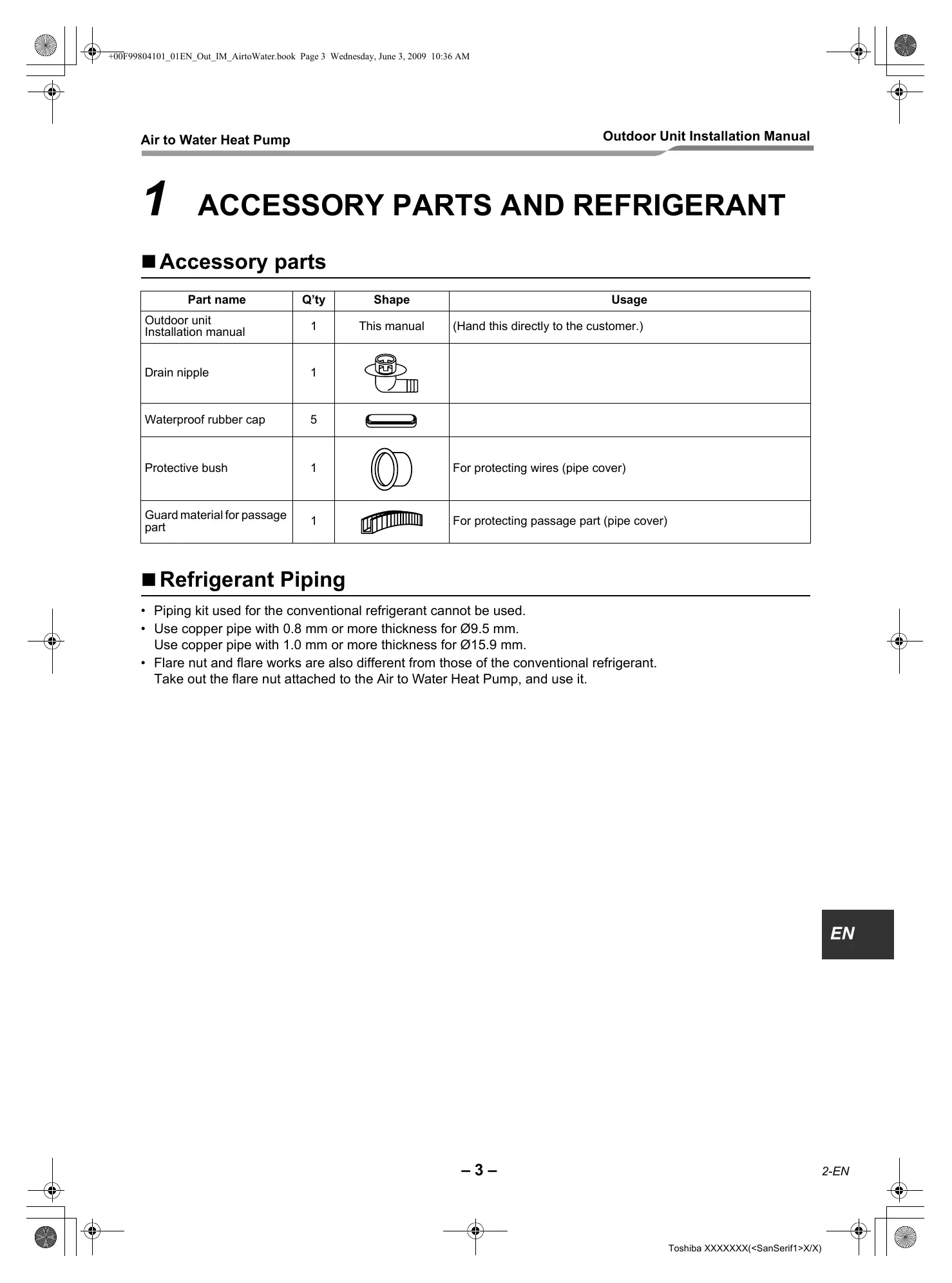 4 +00F99804101_O1EN_ Out IM_AirtoWater book Page 3 Wednesday, June 3, 2009 10:36 AM Air to Water Heat Pump Outdoor Unit Installation Manual