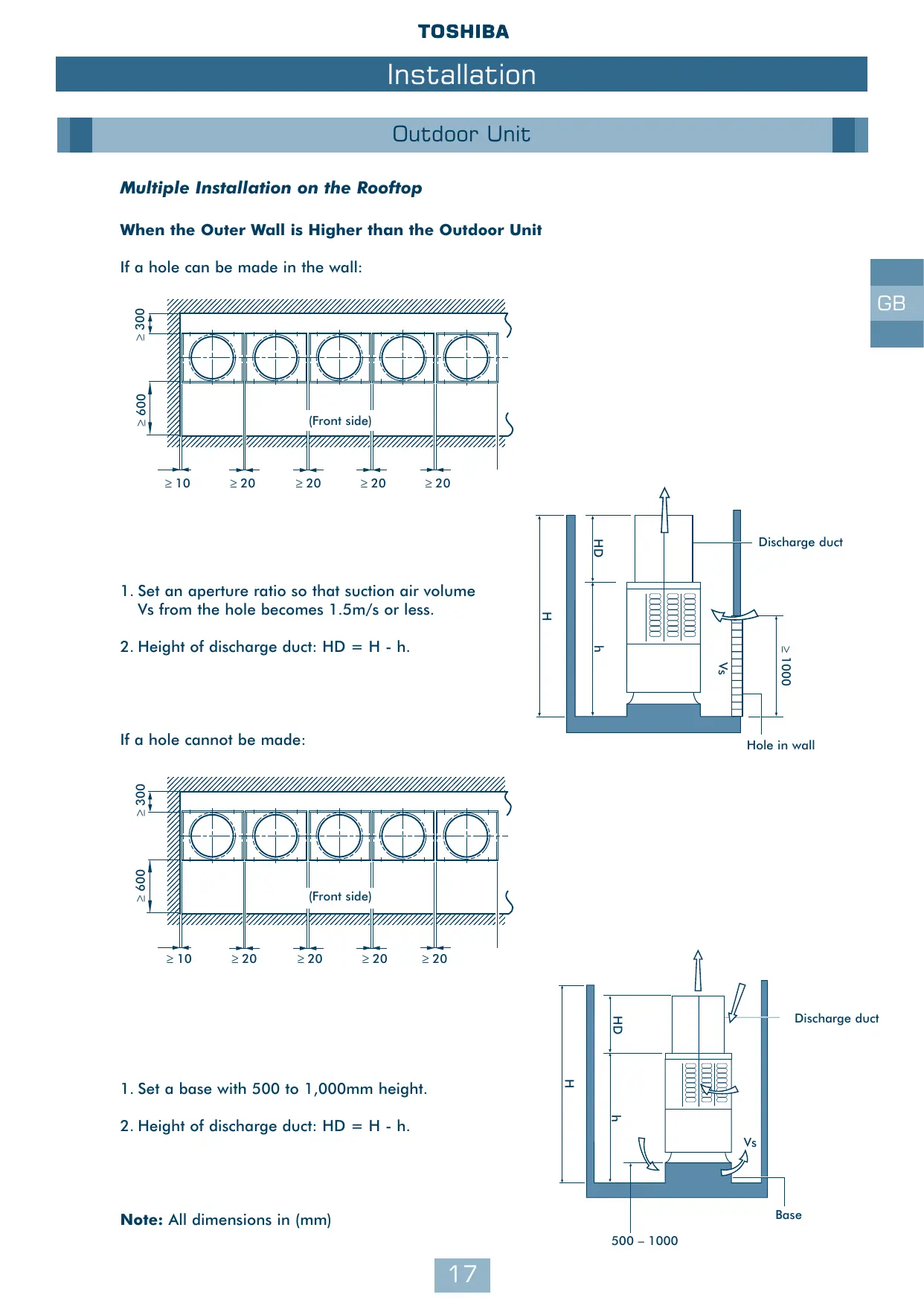 1. Set a base with 500 to 1,000mm height. FT 2. Height of discharge duct: HD = H-h. Note: All dimensions in (mm) Base