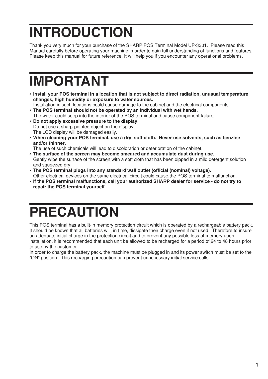INTRODUCTION Thank you very much for your purchase of the SHARP POS Terminal Model UP-3301. Please read this Manual carefully before operating your machine in order to gain full understanding of functions and features. Please keep this manual for future reference. lt will help you if you encounter any operational problems. IMPORTANT + Install your POS terminal in a location that is not subject to direct radiation, unusual temperature changes, high humidity or exposure to water sources. Installation in such locations could cause damage to the cabinet and the electrical components. + The POS terminal should not be operated by an individual with wet hands. The water could seep into the interior of the POS terminal and cause component failure. + Do not apply excessive pressure to the display. Do not use a sharp-pointed object on the display. The LCD display will be damaged easily. + When cleaning your POS terminal, use a dry, soft cloth. Never use solvents, such as benzine and/or thinner. The use of such chemicals will lead to discoloration or deterioration of the cabinet. + The surface of the screen may become smeared and accumulate dust during use. Gently wipe the surface of the screen with a soft cloth that has been dipped in a mild detergent solution and squeezed dry. + The POS terminal plugs into any standard wall outlet (official (nominal) voltage). Other electrical devices on the same electrical circuit could cause the POS terminal to malfunction. + Ifthe POS terminal malfunctions, call your authorized SHARP dealer for service - do not try to repair the POS terminal yourself. PRECAUTION This POS terminal has a built-in memory protection circuit which is operated by a rechargeable battery pack. It should be known that all batteries will, in time, dissipate their charge even if not used. Therefore to insure an adequate initial charge in the protection circuit and to prevent any possible loss of memory upon installation, it is recommended that each unit be allowed to be recharged for a period of 24 to 48 hours prior to use by the customer. In order to charge the battery pack, the machine must be plugged in and its power switch must be set to the “ON" position. This recharging precaution can prevent unnecessary initial service calls.