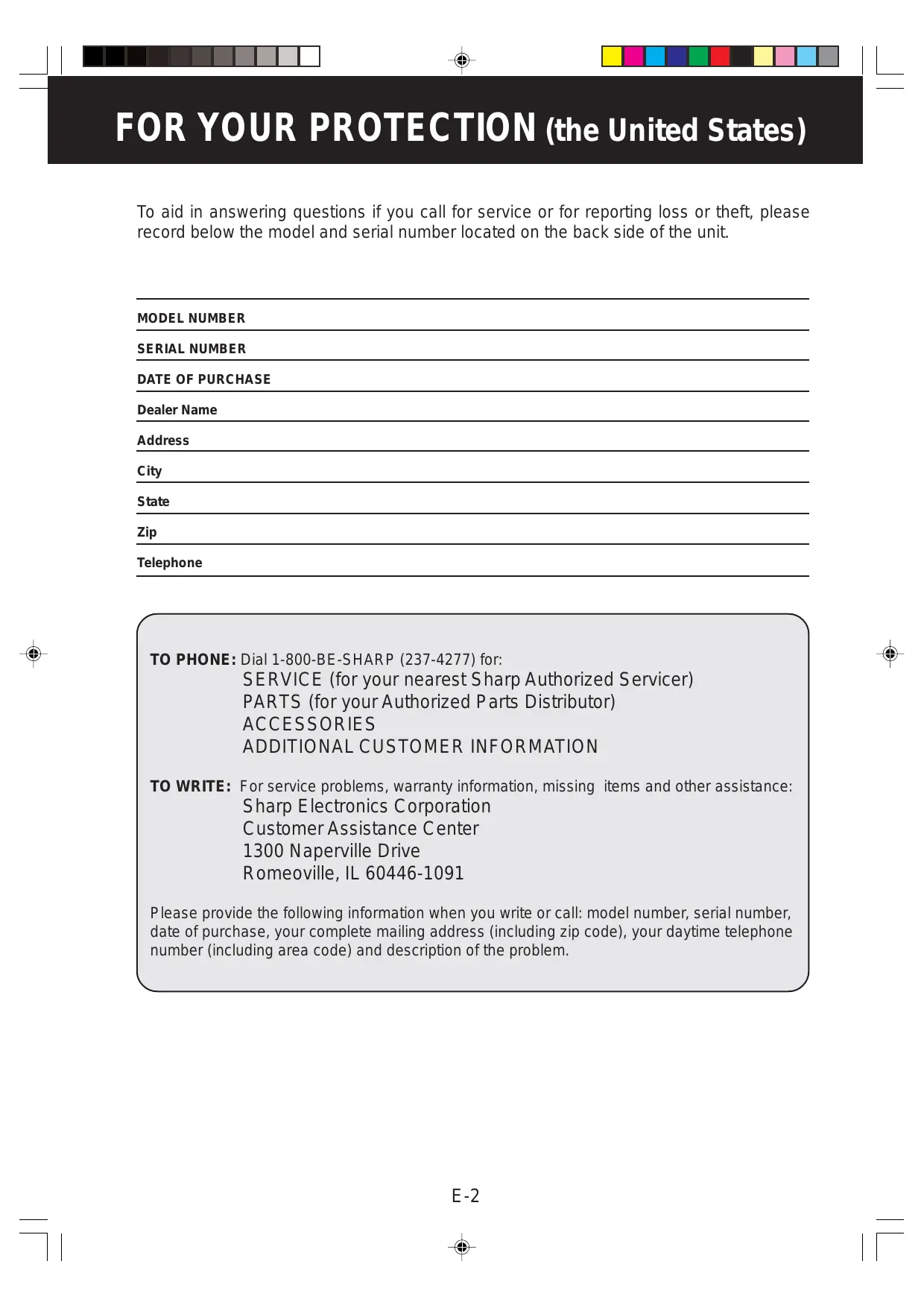 TO WRITE: For service problems, warranty information, missing items and other assistance: Sharp Electronics Corporation Customer Assistance Center 1300 Naperville Drive Romeoville, IL 60446-1091 Please provide the following information when you write or call: model number, serial number, date of purchase, your complete mailing address (including zip code), your daytime telephone number (including area code) and description of the problem. E-2