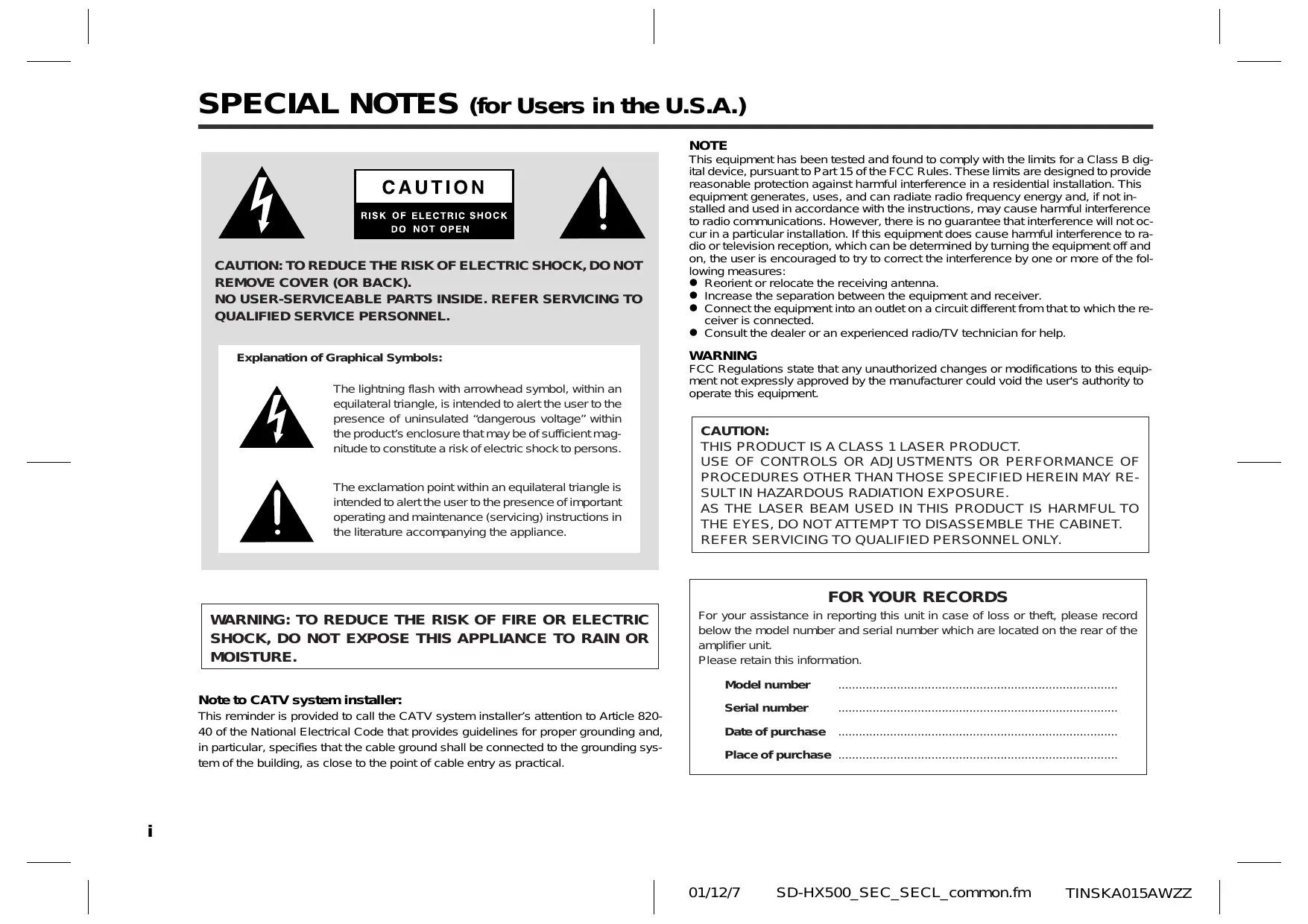 iii 01/12/7 SD-HX500_SEC_SECL_common.fm TINSKA015AWZZ SPECIAL NOTES