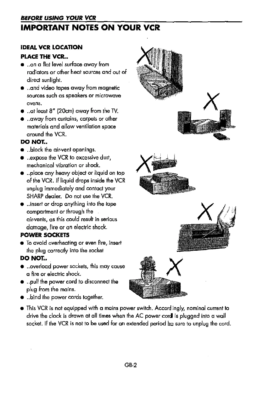 - This VCR is not equipped with a mains power switch. Accord ingly, nominal current to drive the clock is drawn at all times when the AC power corel is plugged into a wall socket. If the VCR is not to be used for an extended period be sure to unplug the cord. GB·2 BEFORE USING YOUR VCR