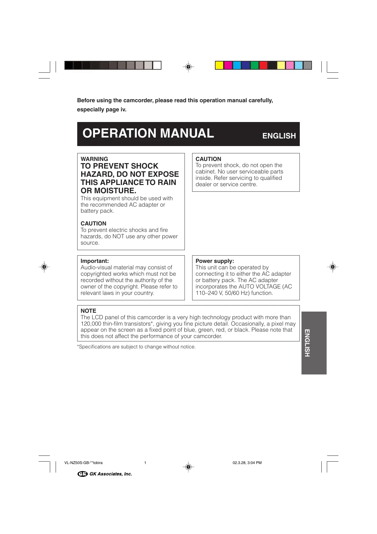 OR MOISTURE. This equipment should be used with the recommended AC adapter or battery pack. CAUTION To prevent electric shocks and fire hazards, do NOT use any other power source. CAUTION To prevent shock, do not open the cabinet. No user serviceable parts inside. Refer servicing to qualified dealer or service centre. Important: Audio-visual material may consist of copyrighted works which must not be recorded without the authority of the owner of the copyright. Please refer to relevant laws in your country. Power supply: This unit can be operated by connecting it to either the AC adapter or battery pack. The AC adapter incorporates the AUTO VOLTAGE (AC 110-240 V, 50/60 Hz) function. NOTE The LCD panel of this camcorder is a very high technology product with more than 120,000 thin-film transistors”, giving you fine picture detail. Occasionally, a pixel may appear on the screen as a fixed point of blue, green, red, or black. Please note that this does not affect the performance of your camcorder. “Specifications are subject to change without notice VL-NZS0S-GB-"tobira 1 @ GK Associates, Inc.