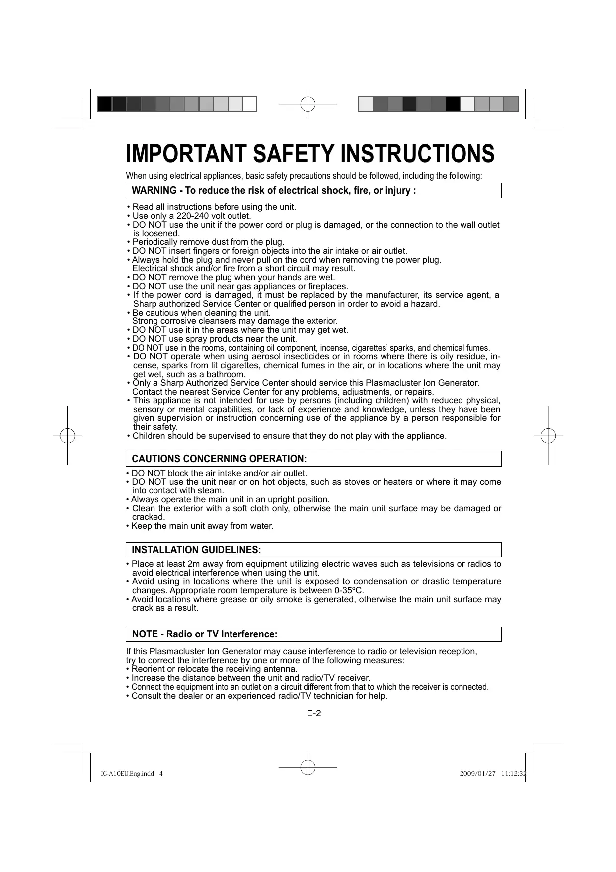 WARNING - To reduce the risk of electrical shock, fire, or injury : • Read all instructions before using the unit. • Use only a 220-240 volt outlet. • DO NOT use the unit if the power cord or plug is damaged, or the connection to the wall outlet is loosened. • Periodically remove dust from the plug. • DO NOT insert fingers or foreign objects into the air intake or air outlet. • Always hold the plug and never pull on the cord when removing the power plug. Electrical shock and/or fire from a short circuit may result. • DO NOT remove the plug when your hands are wet. • DO NOT use the unit near gas appliances or fireplaces. • If the power cord is damaged, it must be replaced by the manufacturer, its service agent, a Sharp authorized Service Center or qualified person in order to avoid a hazard. • Be cautious when cleaning the unit. Strong corrosive cleansers may damage the exterior. • DO NOT use it in the areas where the unit may get wet. • DO NOT use spray products near the unit. • DO NOT use in the rooms, containing oil component, incense, cigarettes’ sparks, and chemical fumes. • DO NOT operate when using aerosol insecticides or in rooms where there is oily residue, incense, sparks from lit cigarettes, chemical fumes in the air, or in locations where the unit may get wet, such as a bathroom. • Only a Sharp Authorized Service Center should service this Plasmacluster Ion Generator. Contact the nearest Service Center for any problems, adjustments, or repairs. • This appliance is not intended for use by persons (including children) with reduced physical, sensory or mental capabilities, or lack of experience and knowledge, unless they have been given supervision or instruction concerning use of the appliance by a person responsible for their safety. • Children should be supervised to ensure that they do not play with the appliance.