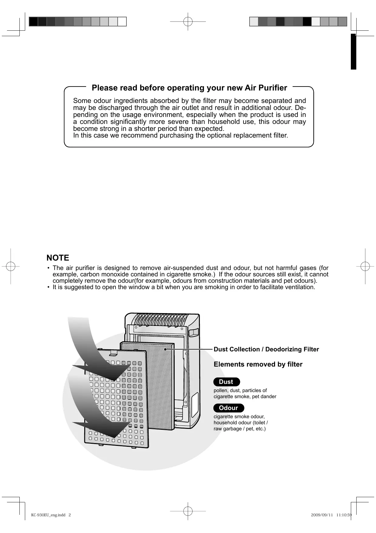 - The air purifier is designed to remove air-suspended dust and odour, but not harmful gases (for example, carbon monoxide contained in cigarette smoke.) If the odour sources still exist, it cannot completely remove the odour(for example, odours from construction materials and pet odours).