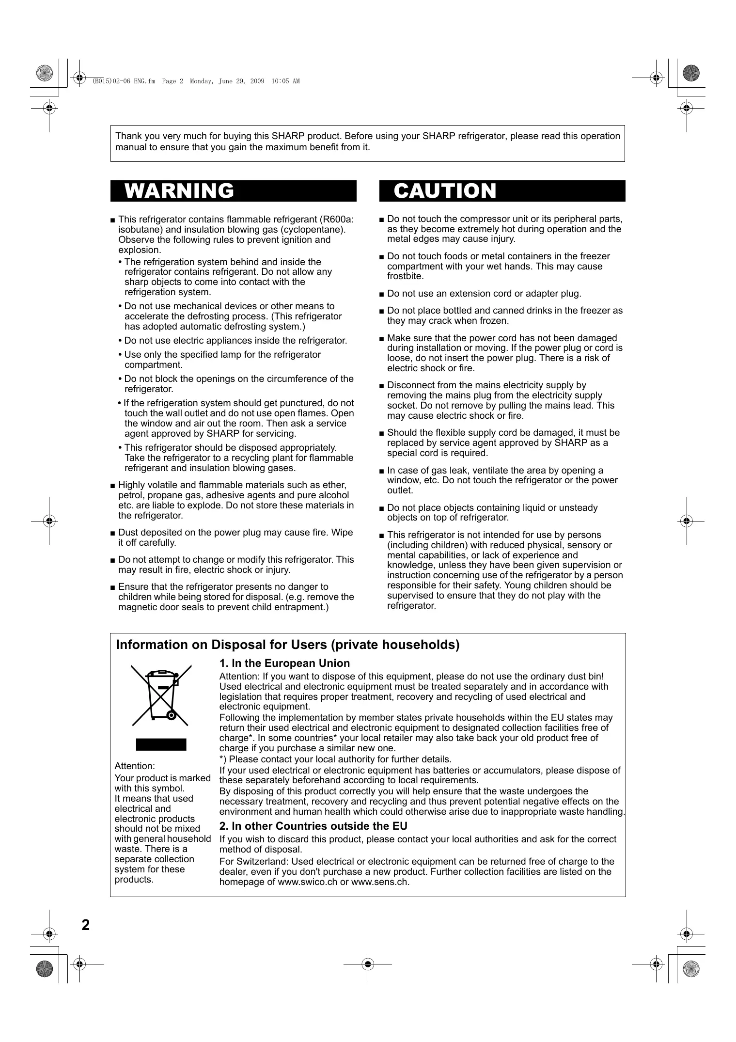 - Free standing type SJ-TD591S SJ-TD641S SJ-TD691S Page 2 Monday, June 29, 2009 10:05 AM Thank you very much for buying this SHARP product. Before using your SHARP refrigerator, please read this operation manual to ensure that you gain the maximum benefit from it. WARNING