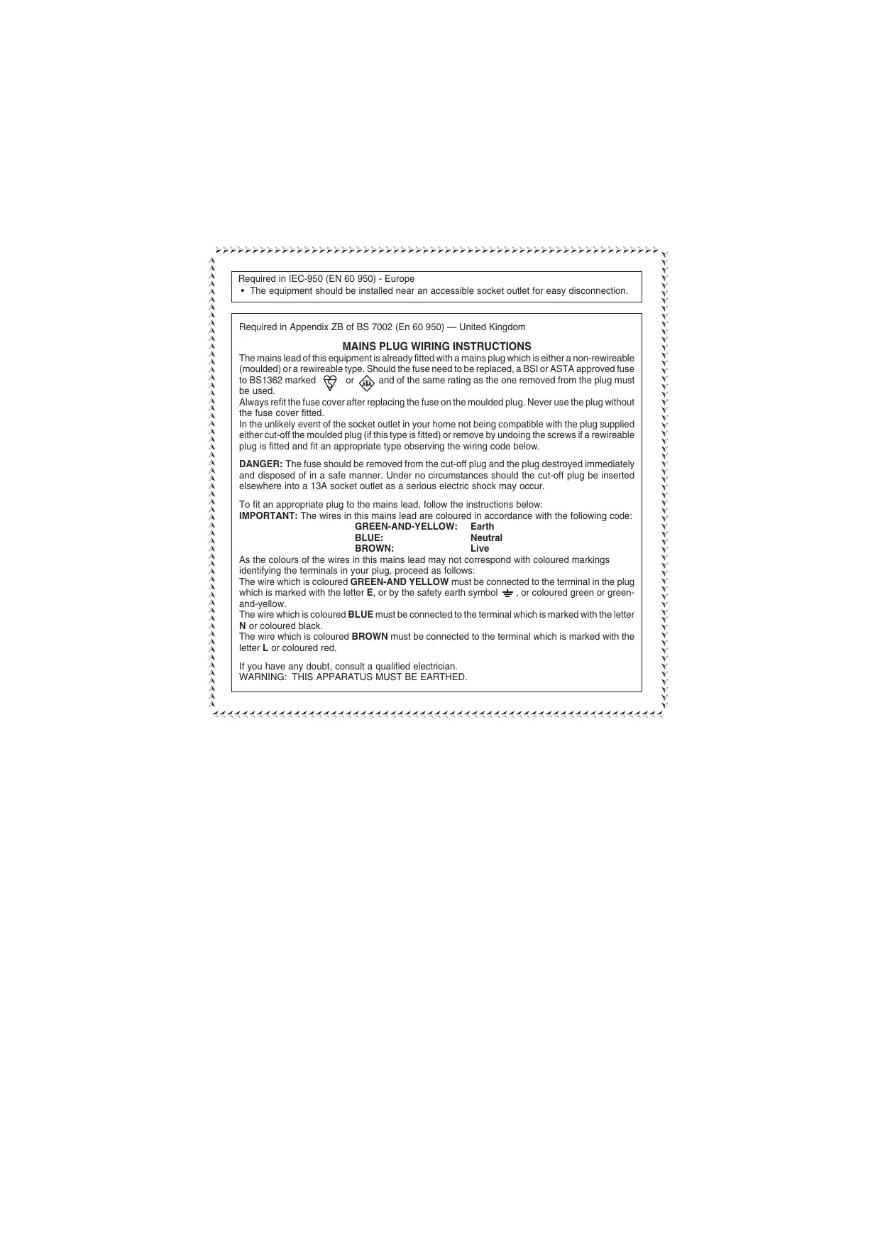 Required in Appendix ZB of BS 7002 (En 60 950) — United Kingdom