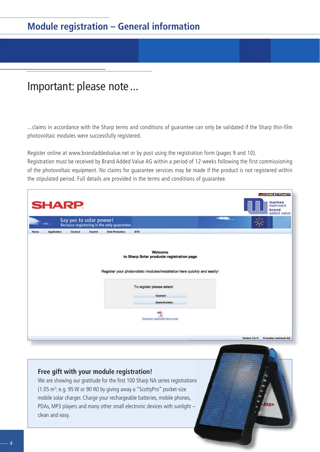 Register Sharp thin-film modules online at www.brandaddedvalue.net.
