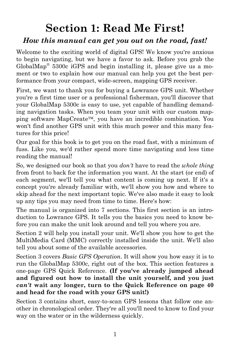 run the GlobalMap 5300c, right out of the box. This section features a one-page GPS Quick Reference. (If you've already jumped ahead and figured out how to install the unit yourself, and you just can't wait any longer, turn to the Quick Reference on page 40 and head for the road with your GPS unit!) Section 3 contains short, easy-to-scan GPS lessons that follow one another in chronological order. They're all you'll need to know to find your way on the water or in the wilderness quickly.