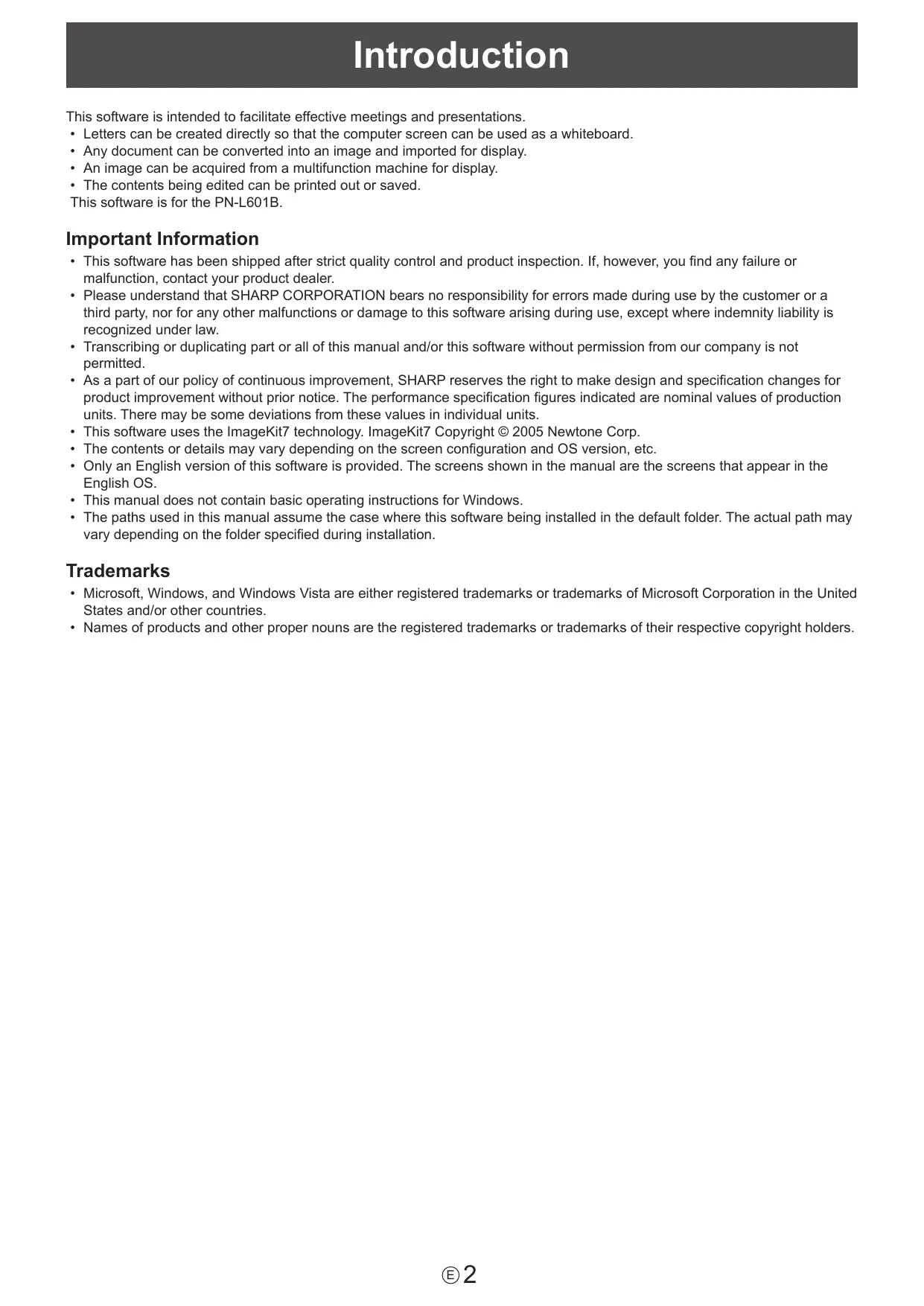 Please understand that SHARP CORPORATION bears no responsibility for errors made during use by the customer or a third party, nor for any other malfunctions or damage to this software arising during use, except where indemnity liability is recognized under law.